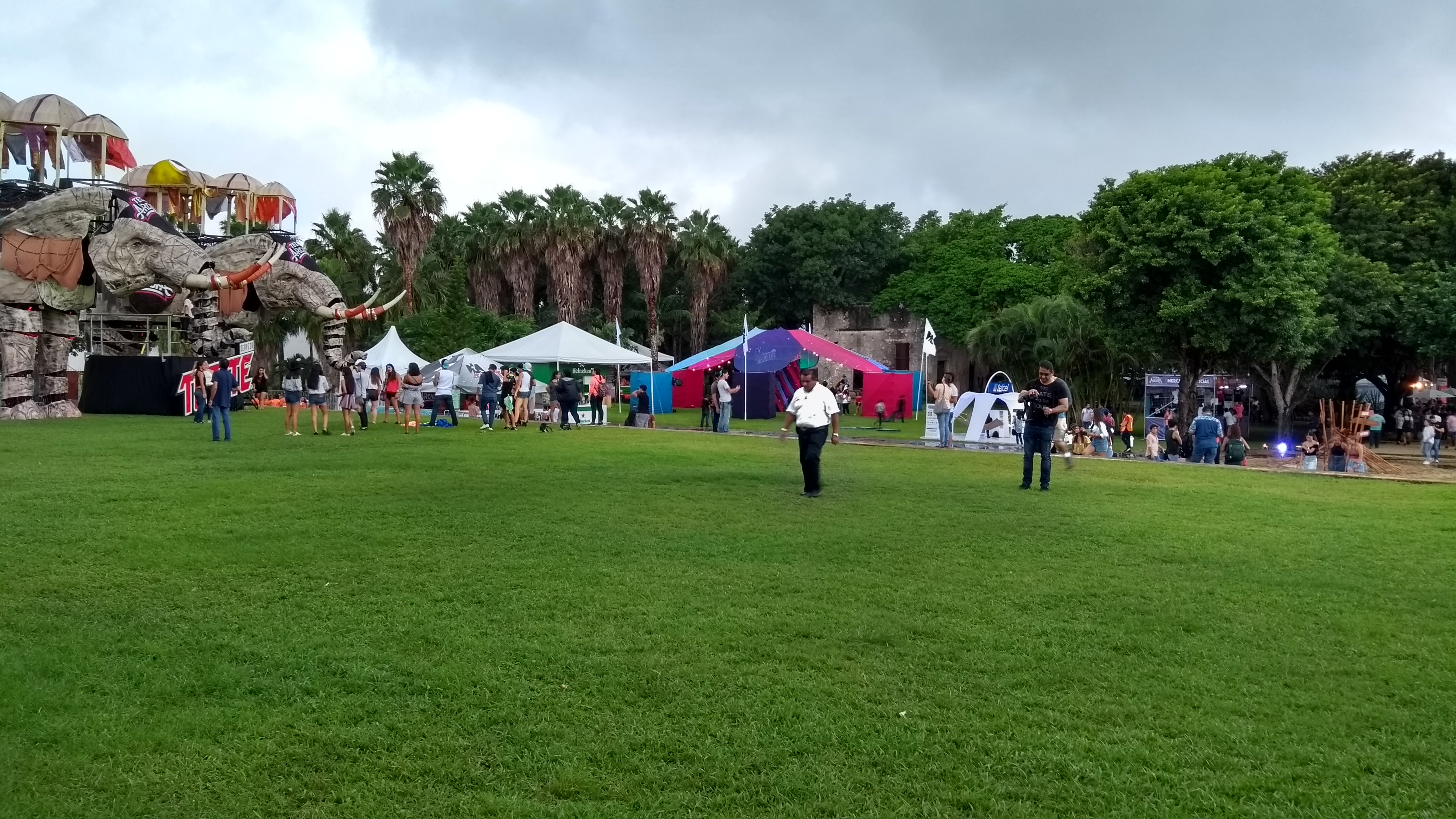 Das Gelände nennt sich Hacienda Chichi Suárez. Die nicht besonders große aber ausgesprochen schöne Anlage allein wäre den Besuch bereits wert gewesen. Unter alten großen Bäumen betritt man das an den Ausläufern des Urwalds gelegene Gelände und sieht zu seiner rechten hinter Agaven und unter Bäumen versteckt alte Bögen, hinter denen man sich ausruhen kann. Zur linken befinden sich ähnliche, aber besser in Stand gehaltene Bögen, durch die man zur ersten Bühne gelangt. Läuft man geradeaus, dann trifft man auf zwei Elefanten, die an die Olifanten aus dem „Herr der Ringe“ erinnern und die Maskottchen der Veranstaltung sind. Tritt man durch die Bögen hindurch, gelangt man zu den Essensständen, an denen erstaunlich Preiswert verschiedenstes Bier und logischerweise Essen erworben werden. Hinter den Ständen führt ein kleiner Weg zur zweiten, etwas größeren Bühne und den Klos, an denen ich bemerkenswerterweise nicht anstehen musste.