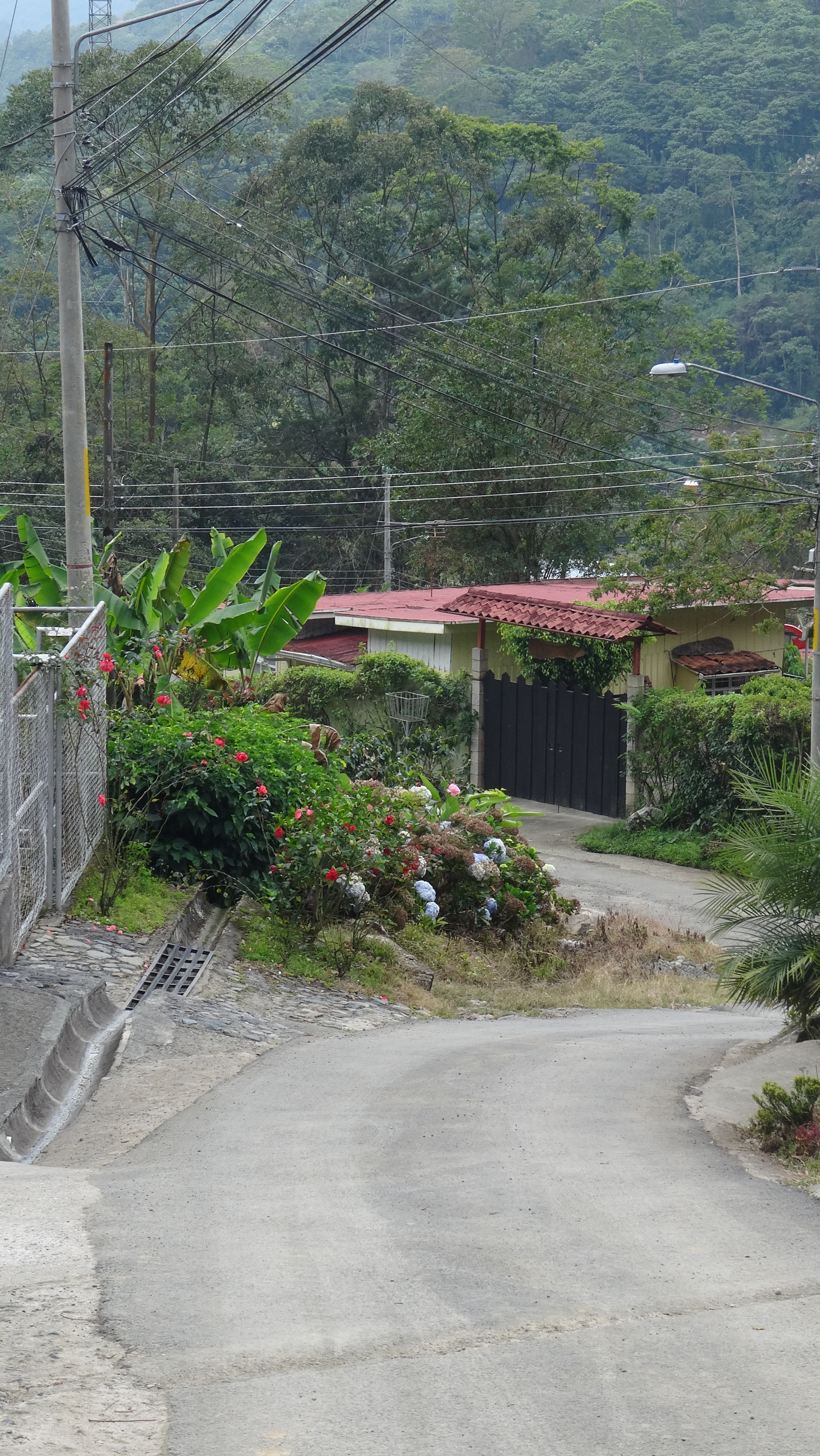 Wir folgten der Hauptstraße durch das Tal ungefähr eine Stunde lang immer auf der Suche nach einer Tankstelle namens La Bomba. Natürlich fanden wir diese Tankstelle nicht und irrten deshalb auch ein oder zweimal den gleichen Weg hin und zurück. Weiterhin ohne unsere Tankstelle machten wir uns dann langsam den Berg hinauf, immer noch auf der Straße laufend. Wir passierten dabei allerlei Häuser, Fußballplätze und einen kleinen Teil der wunderschönen Natur Costa Ricas.