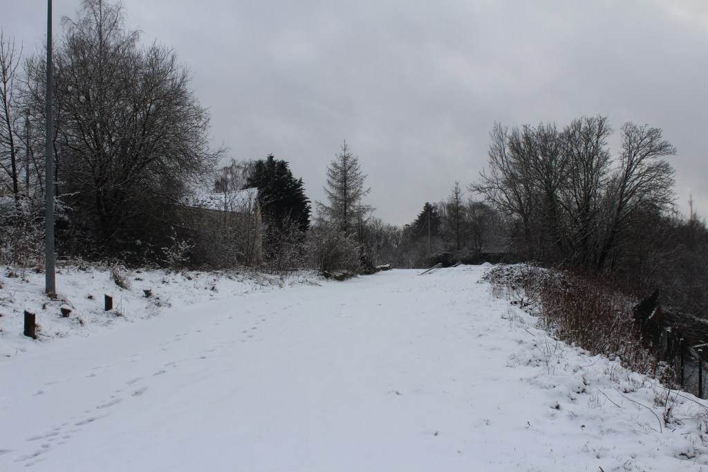 Die wenigen Stunden nutzte ich für einen Nachmittagsspaziergang, selbstverständlich ohne das passende Schuhwerk. An Badelatschen habe ich gedacht, aber damit, dass es schneit habe ich nun wirklich nicht gerechnet. Immerhin nicht in den genannten Badelatschen, sondern in meinen „Berliner Winterschuhen“ setzte ich also behutsam meinen Fuß vor die Haustür, trat sogleich in die erste matschige Pfütze und ertrank meinen Socken in der kalten Soße. Doch es gab keinen Weg zurück. Ich erkundete meine erneut ganz unbekannte Umgebung, denn obwohl ich diesen Weg schon gegangen war, zeigte er sich heute in einer nicht wiederzuerkennenden Gestalt. Unten im „Pafendall“ angekommen, steuerte ich in Richtung Park, den ich bereits joggend erkundet habe.
