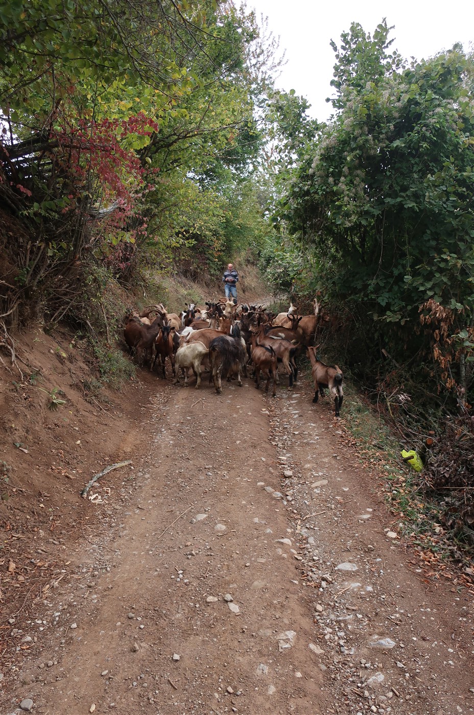 Ich startete den Tag im idyllischen Plav, dem am See gelegenen Ort mit seiner Holzmoschee. Bei einer hier ansässigen Bäckerin kaufte ich mir süße Gebäckstücke mit Erdbeer- und Schokoladenfüllung, dazu noch ein bisschen Obst im Markt gegenüber. Die erste Herausforderung erwartete mich auf dem Weg in Richtung Vusanje. Ein kunterbunter Haufen Ziegen kündigte sich durch penetrantes Gebimmel an und damit natürlich auch die Gefahr eines Wachhundes. Wie ich durch das Gewusel durchkam, weiß ich nicht mehr, doch das Pfeifen des Schäfers bewirkte, dass sich die meckernden Böcke blitzartig nach links orientierten, ihre Dichte dabei nochmal erhöhten und mir so einen schmalen Weg freimachten.