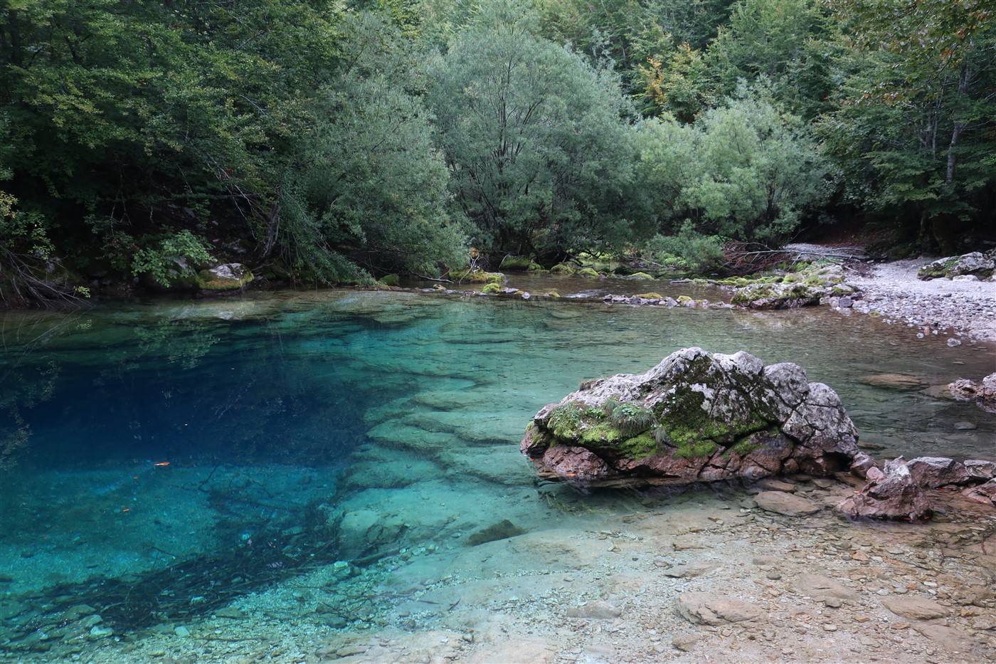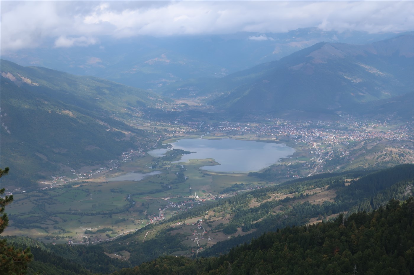 Nachdem ich auf einer von Himbeeren übersäten und Pferden bevölkerten Wildwiese mein Essen, welches eher einer Nachspeise als eines Mittags gleichkam, verspeiste, startete erst der echte Aufstieg mit 100 prozentiger Steigung. Hier war Schluss mit lustig. Der Weg war schmal, mit Wurzeln übersät und ich vergaß im Konzentrationstunnel meine Umgebung wahrzunehmen. Doch, wie so häufig, die Mühen waren es wert: Vor mir erstreckte sich noch einmal der majestätische Plav-See, in den sich ein schlängelnder Fluss, umgeben von einer Allee schmucker Bäume, ergoss.