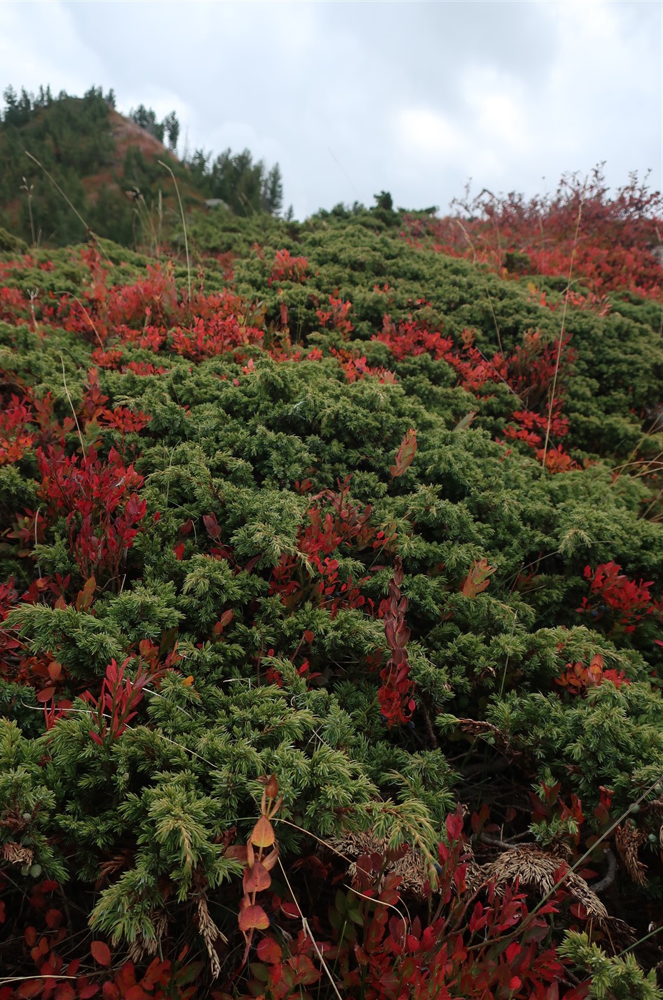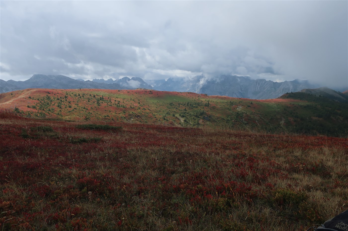 Aber auch hier oben ließ es sich, mal abgesehen von den recht menschenfeindlichen Wetterbedingungen, aushalten: Neben lilafarbenen Steinen wuchsen Blaubeersträucher und Weidenröschen. Über einen Bergkamm ging es in einer selten so wahrgenommenen Stille an Seen vorbei, im fernen Hintergrund ein schneegraues Bergmassiv. Zeit für noch eine Pause. Diesmal schälte ich die Orange, die ich aus Plav mitbrachte, doch musste enttäuscht feststellen, dass ich eine Blutorange gekauft habe, von denen ich noch ein Trauma habe, da ich während eines Trinkspiels einmal eine mit Salz essen musste.