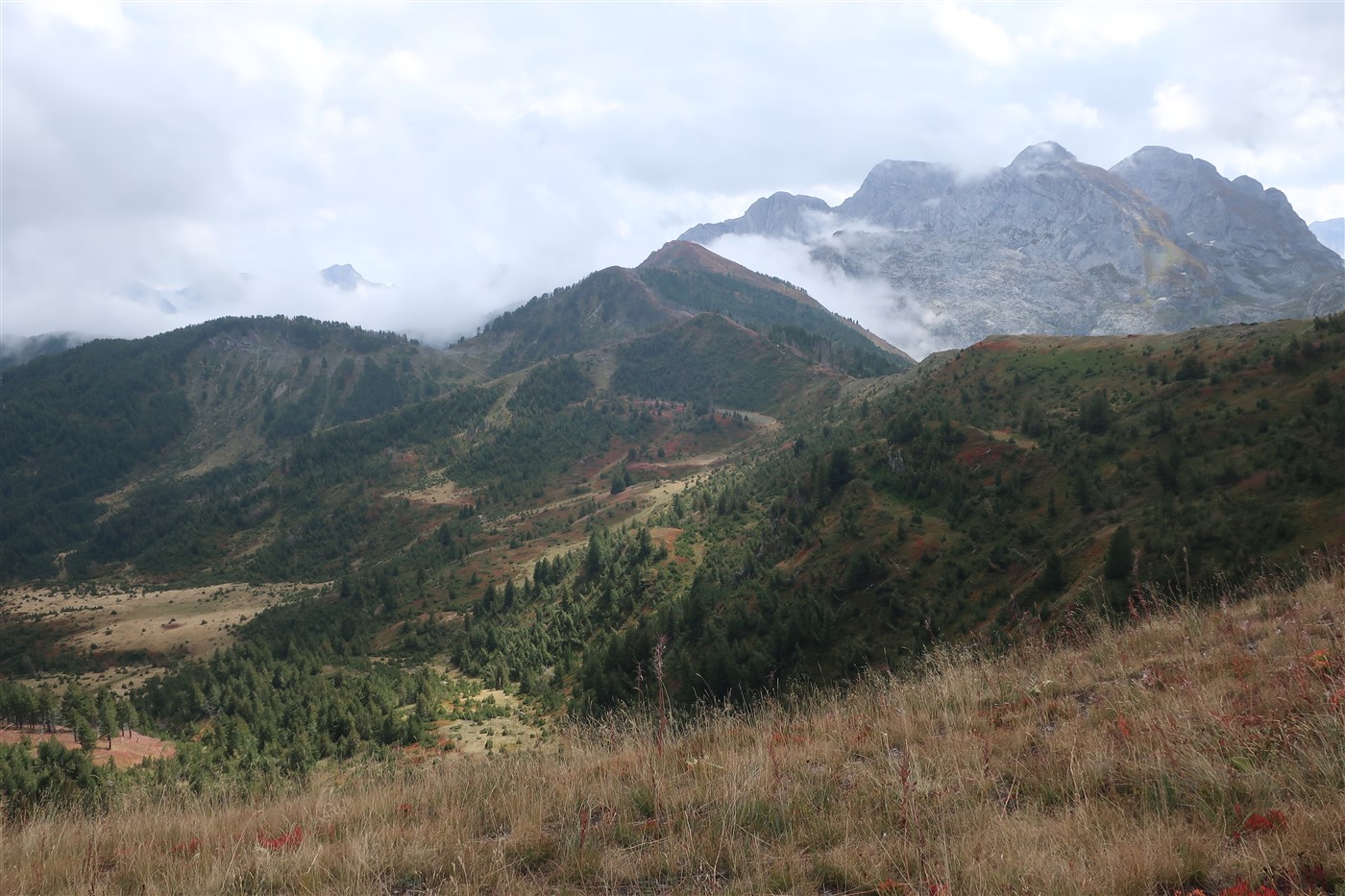 Kurz verzehrte ich mein Mittagspaket und schon ging es schnell weiter, bis der Wald uns wieder vor dem Wind schützte. Schon nach kurzer Zeit konnte ich stolz auf den erklommenen Berg zurückblicken: Mit seinen sich immer noch dort türmenden Wolken sah er aus wie ein kochend überschäumender Dampfkessel. Ab jetzt war der Weg einfacher, es handelte sich dabei leider und zum Glück schon um die letzten Kilometer auf meiner Reise. Noch einmal genoss ich einen Tee in einer aus Holz gezimmerten Bar, ließ mich von ein paar Hunden verfolgen und kam dann, ganz allmählich, in Theth, dass ich an seiner kleinen Kirche erkannte, an.