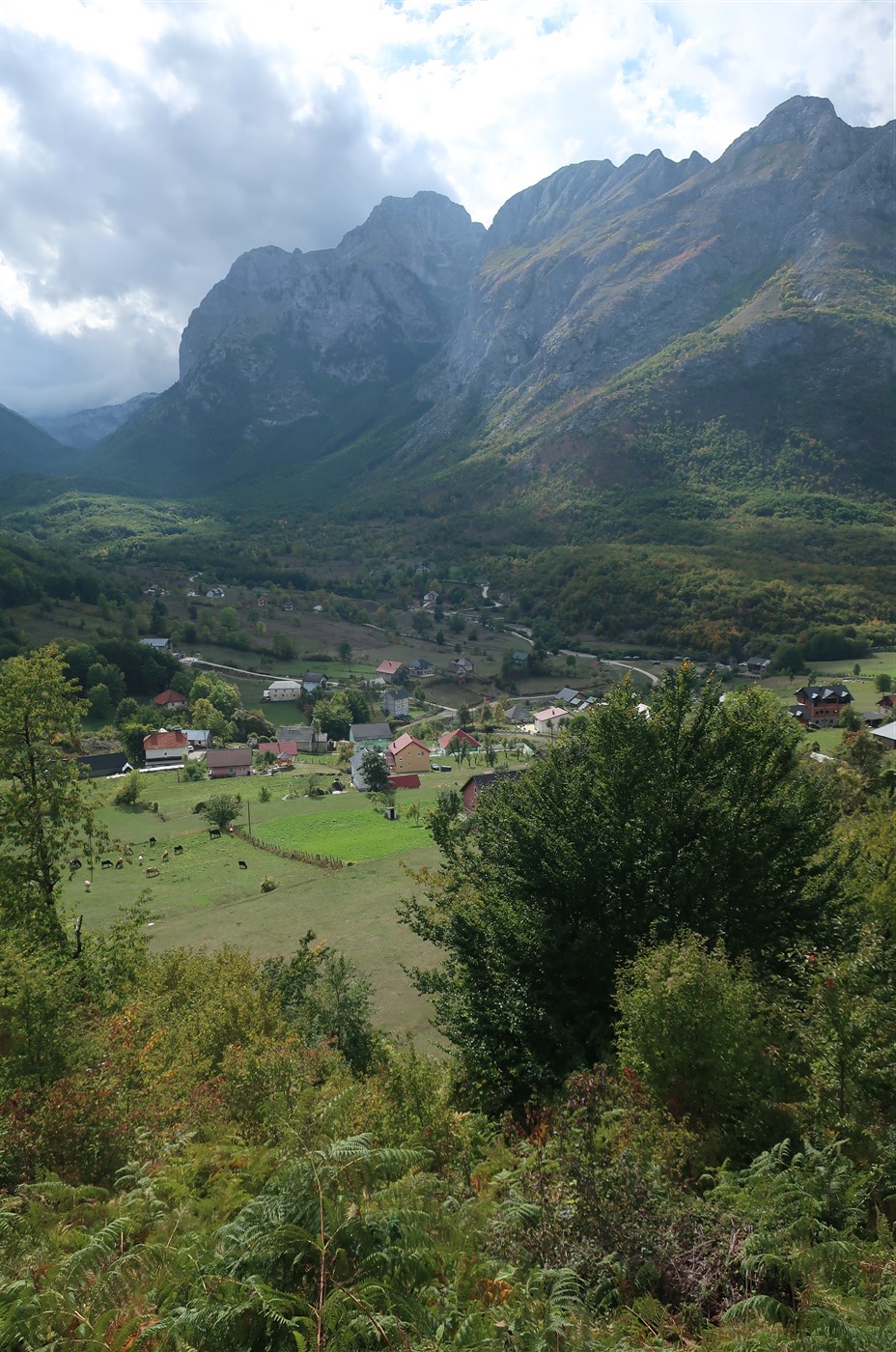 Die traumhafte Szenerie wurde nur kurz gestört: Ein Wachhund, der eifrige Blaubeerpflücker beschützte. Ich suchte für fünf Minuten nach einem Verteidigungsstock, mein Puls zog mächtig an, doch es ging alles gut. Die Wanderung auf dem Pass war himmlisch und es stimmte mich fast traurig, dass ich nach einigen Kilometern schon absteigen musste. Wieder an Pferden vorbeilaufend, die von den Blaubeerpflückern hier wie mehrere Mercedes geparkt wurden, zog sich das Herunterlaufen hin. Ich genehmigte mir noch ein Energiegel (nicht Energieegel) und wanderte nach Vusanje – natürlich auch wieder bildhaft schön zwischen den Bergen gelegen, langsam gehen mir wirklich die Beschreibungen aus.