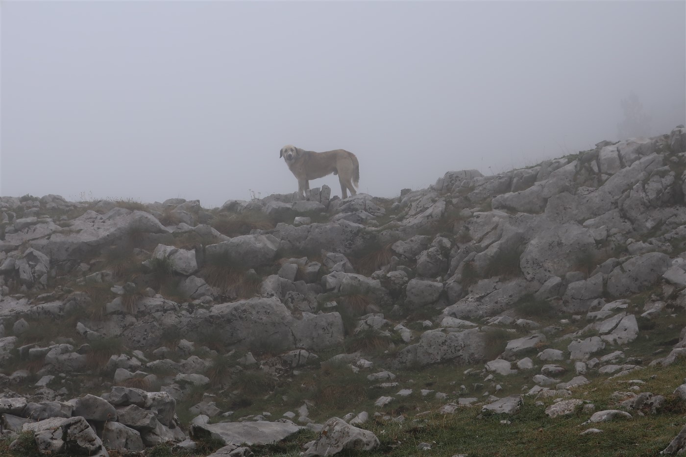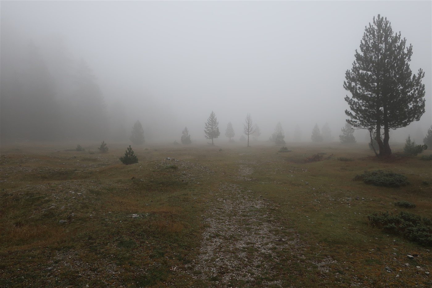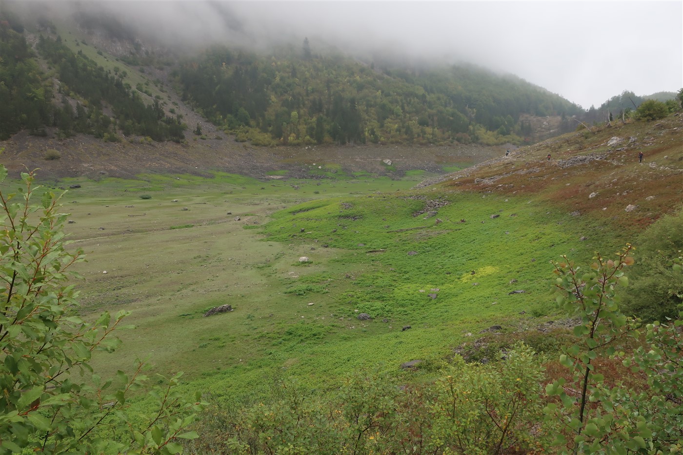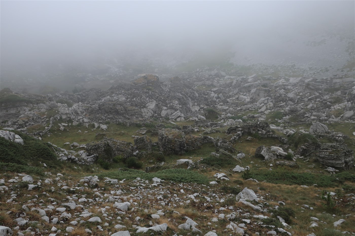 Der Weg zeigte immer weiter nach oben, denn auch er hatte vor mich heute in karstiges Steingebirge zu führen. Mitkriegen sollte ich davon jedoch nicht sonderlich viel, denn die meiste Zeit wanderte ich in einer trüben Wolke, in der ich mir nie sicher sein konnte, ob es gerade regnete oder einfach nur durchgehend feucht war. An einem epischen See vorbei, dem leider jemand den Stöpsel gezogen hatte, hörte ich mystische Trompetenlaute in der Ferne. Von dem sich im leeren Becken befindlichen Schlangen, die ich zum Glück nicht zu sehen bekam, kamen diese Töne wahrscheinlich nicht. Näher an den Ursprung dieser Geräusche kam ich jedoch nicht.