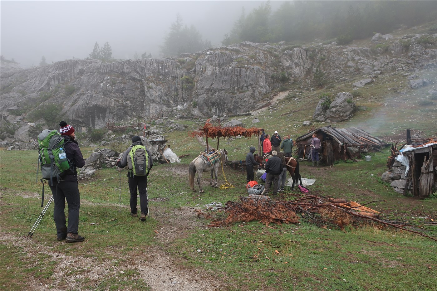 Der steile serpentinenartige Abstieg zog sich einige Kilometer hin, zwischenzeitlich machte ich mit meinen Gefährten eine Pause bei einer weiteren Wandergruppe, die sich mitsamt einem Guide an einem Feuer wärmte. Hier, die Sicht war schon etwas klarer, konnte ich bereits das Tal mitsamt dem Start- und Zielort Theth erkennen. Lohnenswert war aber auch der Blick zur Seite zu den schroffen Felsen, deren farbigen Einprägungen ihre Millionen Jahre alte Existenz verrieten.