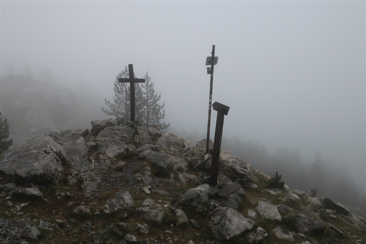 Den Gipfel konnte ich kaum genießen, denn hier erreichte der Wind seine Höchstgeschwindigkeit, dass ich Kopfschmerzen bekam. Oder war es der Raki? Jedenfalls sah ich an einem Gipfelkreuz, dass Jesus auch hier war, machte ein zittriges Foto und sah zu, dass ich wieder in Gefilde kam, die dem Menschen einen angenehmeren Lebensraum bieten.