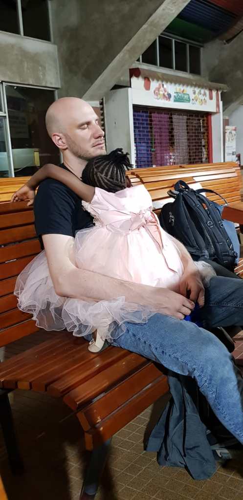 Bevor ich dann endlich die Augen schließen konnte hatte ich noch eine Aufgabe: Es war das Kind des Bräutigams aus erster Ehe, welches er uns für die Rückreise anvertraut hatte. Solch ein Vertrauen in uns für die Aufgabe die kleine Maus mit nach Yaoundé zu nehmen war bemerkenswert. Da ihre jungen Beinchen nicht mehr ganz wollten, kümmerte ich mich darum, dass die Kleine unbeschwert ankommt.