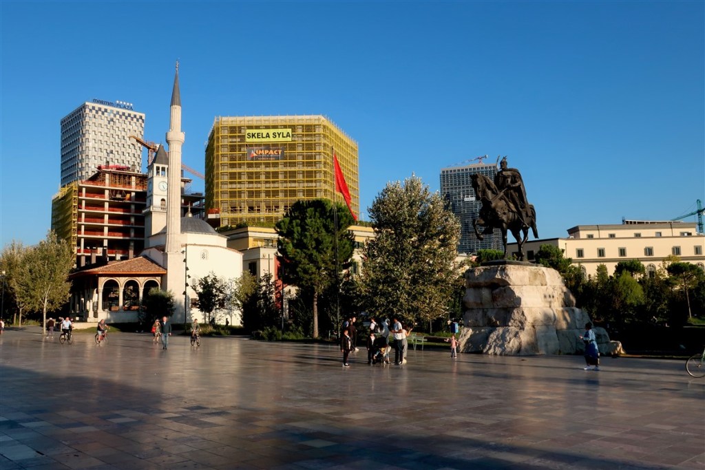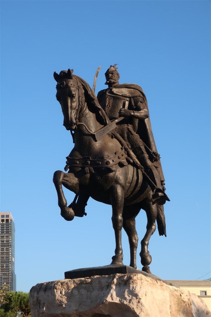Nun endlich zu Tirana: Ich traf mich am Tag des zweiten Umzugs mit einer albanischen Freundin, die mir gut informiert ihre Jugendstadt zeigte. Alles dreht sich um den Skanderbergplatz, in dessen Mitte der berüchtigte Skanderberg (keine Erhebung) auf seinem hohen Rosse sitzt. Der Mann ist das Symbol Albaniens nationaler Einheit. Schließlich war er es, der in heroischen Schlachten die Ottomanen aufhielt. Doch wurde er damit nicht zum Symbol gegen den Islam. Er propagierte stattdessen gleichzeitig das friedliche Zusammenleben aller Glaubensrichtungen und legte somit den Grundstein für Albaniens religiöse Diversität, die auch Enver Hoxhas fast 50-jährige kommunistische Diktatur nicht vollständig aus den Köpfen der Menschen entfernen konnte. Ein wahrer Nationalheld also.
