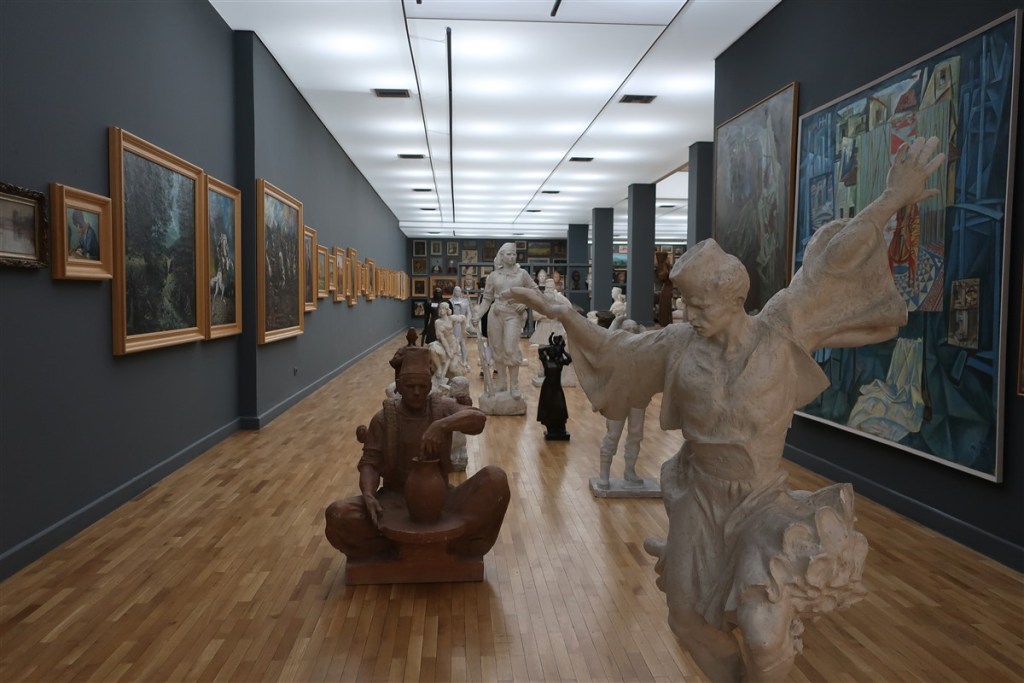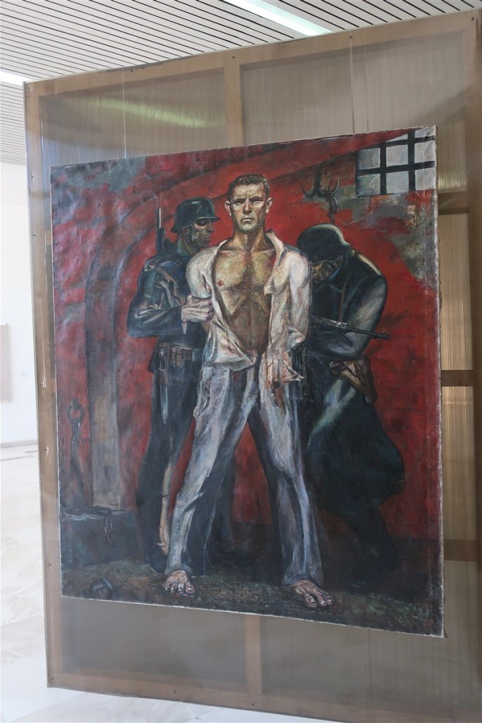 Wir besuchten die nationale Kunstgalerie, die eher einem Atelier glich: In einer die Sinne überfordernden Dichte stehen hier Gemälde und Skulpturen der größten albanischen Künstler des letzten Jahrhunderts auf engem Raum. So wie Malern einst nur einfiel, Jesus und Maria zu malen, so sieht man hier auffallend viele Bilder mit heroisch in die Zukunft blickenden Männern, wahlweise mit einem Baby auf dem Arm, einem Hammer in der Hand und dem roten Stern auf der Brust. Fleißig arbeitende Frauen auf den Weizenfeldern kündigen die nächste erfolgreiche Ernte, mit der einmal mehr bewiesen wird, dass Albanien ohne den Rest der Welt überleben kann, an. Die Galerie ist beeindruckend, denn immer wieder merkt man, wie die nicht immer systemkonformen Maler impressionistische Elemente durchfunkeln lassen, die damit ihre Sehnsucht nach anderen Motiven auszudrücken versuchten. Auf diesen Gedanken bin ich freilich nicht selbst gekommen, er stand auf einer der Informationstafeln.