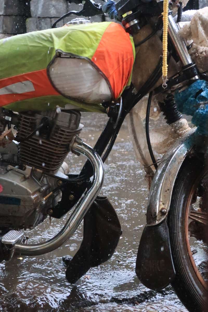 Gerade hatten wir die Motos, die uns wieder zur Hauptstraße bringen sollten, erreicht, da zog sich eine dunkle Wolkenwand, die sich nur wenige Minuten später über den Dächern, die wir gerade rechtzeitig als Unterschlupf fanden, ergießen sollten. Der Beamte ist also in seinem Büro angekommen. Doch ihm ging schnell die reichlich verfeuerte Energie aus. Auch verwandelte sich die schwarze Erde nicht wie die Terra Roxa in eine in sich gefallene, matschige Kleckerburg, sondern hielt weiterhin unserer Last stand. Auf unserem Weg nach Foumbout sah ich trotz des vorhin plötzlich hereingebrochenenen Regens keine einzige Person, die sich von dem Regen überrascht ließ: Alle blieben trocken.