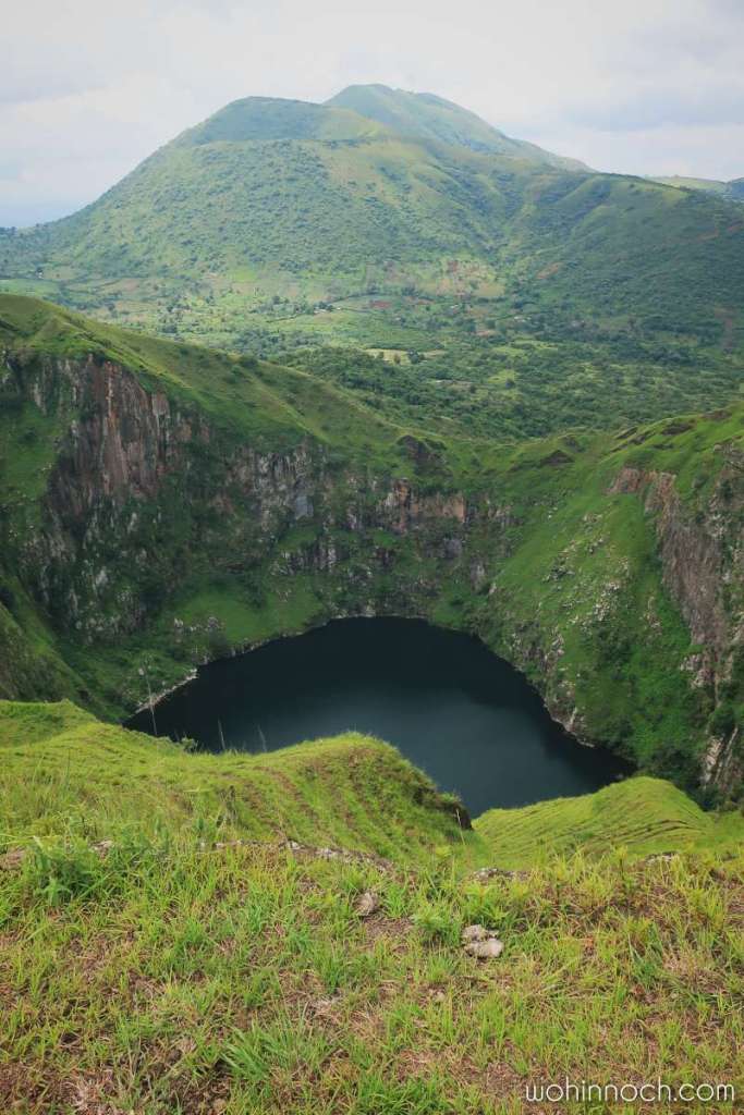 Der Aufstieg bis hierhin war leicht und unbeschwerlich und schließlich erreichten wir nach einer knappen Stunde die Treppen, die sich wie ein Eingang zu einer anderen Welt aufbauten. Oben angekommen breitete sich der Krater im vollen Umfang aus: Während man selbst auf der hohen kreisförmigen Kraterkette steht, muss der Blick fast hundert Meter nach unten fallen, um auf das ruhige Blau des heiligen Gewässers zu treffen. Das verbindende Element war der kluftige Fels, auf dem gegen die Gesetze jeder menschlichen Logik Bäume ihre Wurzeln geschlagen hatten. Genauso unmöglich erschienen die Spuren von den Rindern, die es sich hier manchmal zum Grasen heimelig machen. Wenn selbst diese dicken Wiederkäuer den steilen Abhängen trotzen, so dachten sich wahrscheinlich die Anwohner, dann schaffen wir es erst recht und siehe da: Zu bestimmten Ritualen wird das stille Gewässer zum Baden benutzt.