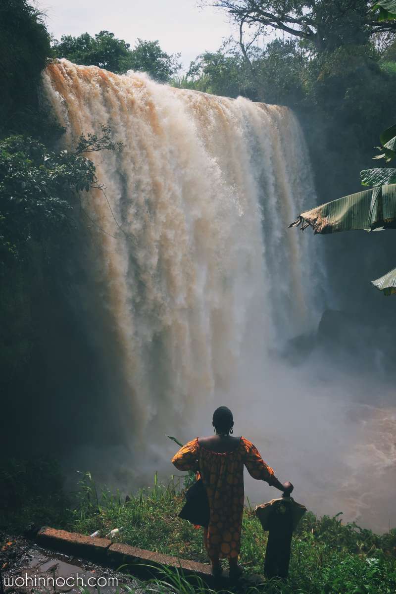 In Bafoussam, wo wir eine Stunde später ankommen sollten, schien dann wieder die Sonne und wir entschieden uns so noch einen kleinen Ausflug zu den Métché Wasserfällen zu unternehmen. Dafür stellt man sich ganz einfach an den Straßenrand und gibt den aufmerksamen Motomännern, die zum Schutz vor Unfällen immer dicke Wintermützen tragen, ein Handzeichen, woraufhin diese anhalten und mit wenigen Worten der Ort angegeben und der Preis verhandelt wird. Während ich in Yaoundé des starken Verkehrs wegen nur in ganz wenigen Situationen das Moto nehmen würde, sieht die Situation in kleineren Städten und vor allem auf dem Land ganz anders aus: Hier ist es oft das einzige realistische Fortbewegungsmittel.