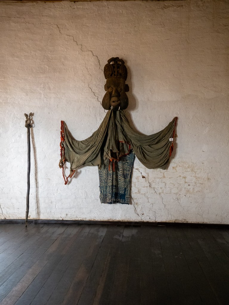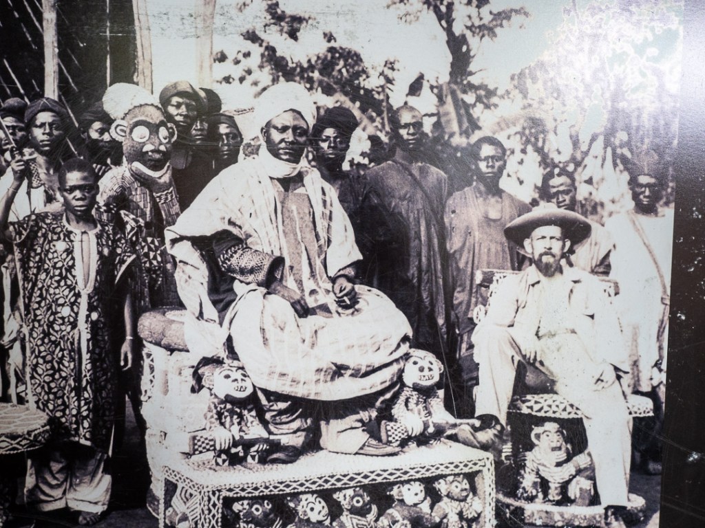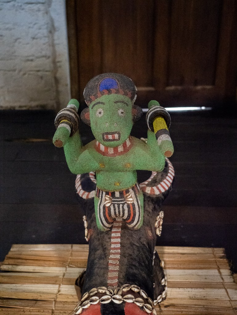 Wir lernen, dass es bereits im 15. Jahrhundert eine Königin gab, dass schon damals Fons die Wilderei durch strikte Lizenzierung einschränkten oder dass jeder Fon alle drei Jahre in einem aufwendigen Ritual von einer Geheimgesellschaft beurteilt und sogar entthront werden kann. Trotz all des Engagements unseres Museumführers stelle ich jedoch beim Blick in den Audienzsaal eine gewisse Leere fest. Als ob irgendetwas fehlt. Tatsächlich befindet sich das wertvollste Objekt – der königliche Thron Njoya Ibrahims – weiterhin im ethnologischen Museum von Berlin. Er ist bei weitem nicht das einzige Objekt, welches auf seine Rückgabe wartet. Ich werde in einem gesonderten Blogeintrag noch genauer auf die Restitutionsbemühungen eingehen.