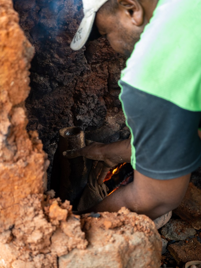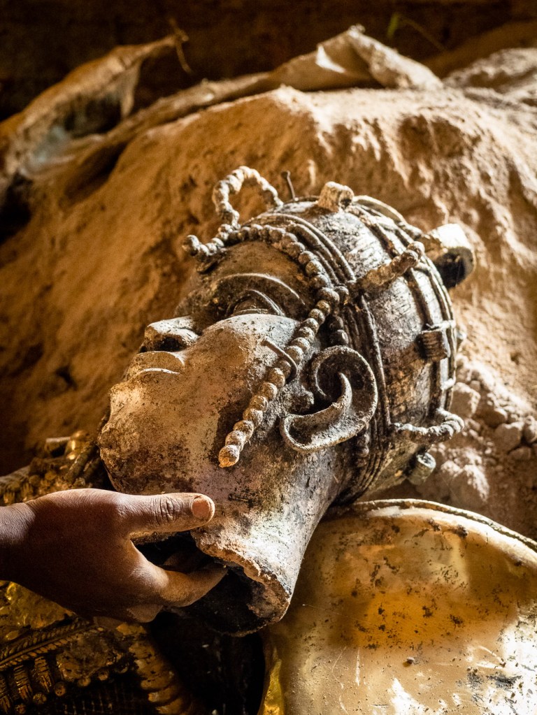 Wir lassen das Museum hinter uns und wenden uns in Richtung der Kunstateliers. Ein eigenes Viertel liegt nur wenige hunderte Meter vom Königspalast entfernt und lässt sich über eine vom Regen durchmatschte Erdstraße erreichen. Seit Jahrhunderten kneten die Bewohner Lehm und Dung zu einem Ton, der dann mit einer Bronzeschicht überzogen wird. Das passiert mit allen Mitteln, die die Natur zu bieten hat: Honig, Hitze und Oxidation. Schließlich, nach mehrmonatiger Arbeit, entstehen detailreiche Figuren von Ringfinger- bis Tigergröße in unterschiedlichen Farbtönen.