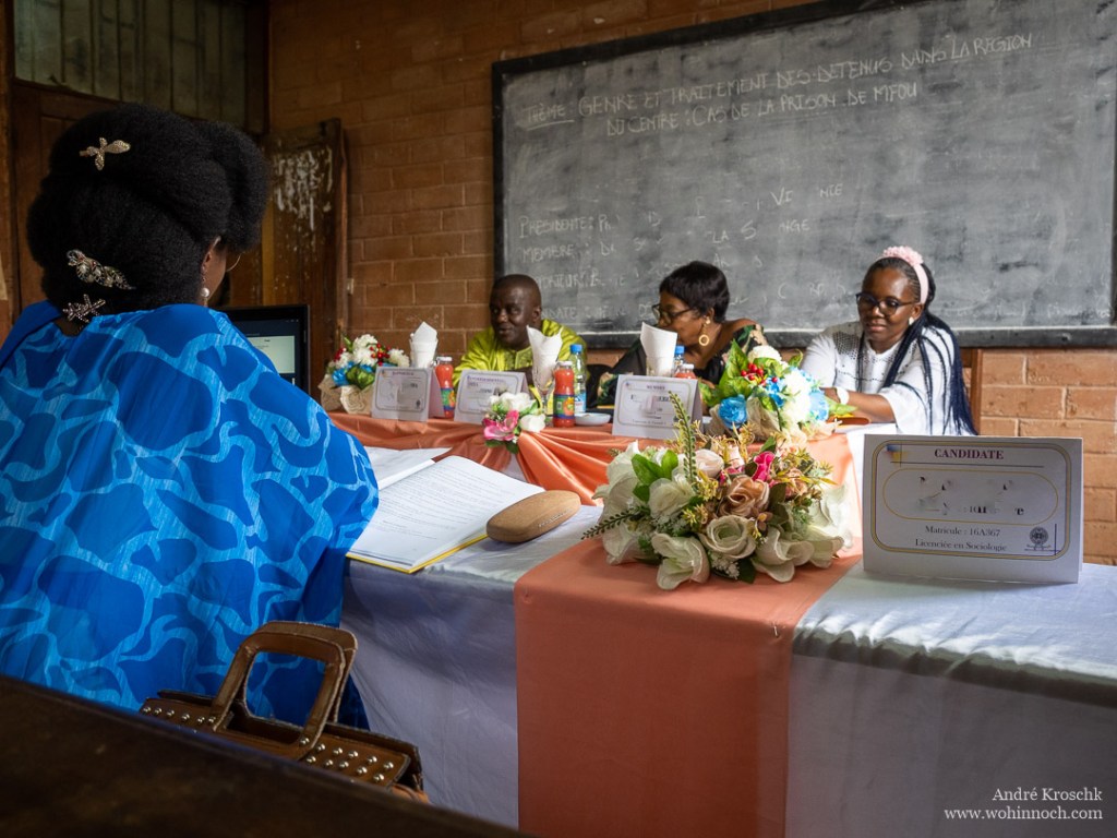 Eine Verteidigung in Kamerun läuft anders, als wir das in Deutschland gewöhnt sind. Nach dem Motto „Good cop, bad cop“ beschützt der eigene Professor die Studentin, während es von Seiten der anderen Gutachter gnadenlose Kritik rasselt. Nicht selten tauchen die Beteiligten dabei ins Anekdotische ab – wenn sie dabei nicht gerade durch einen Anruf unterbrochen werden. „Hier haben schon so manche geheult“ wird mir von der Hinterbank zugeflüstert.