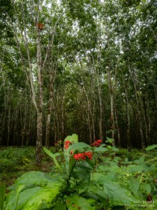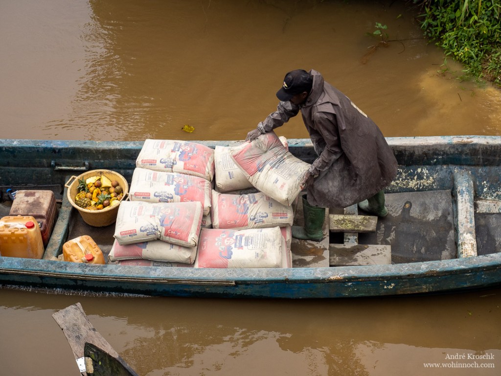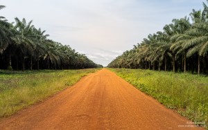 Trotz des Regenfalls, der allen physikalischen Gesetzen zuwider auch noch Mitte November auf uns herabprasselt, winden wir uns in kreativen Kurven vorbei an den tiefen Rinnsalen über die schlammigen Straßen in Richtung Affeninsel. Nachdem wir Edéa hinter uns gelassen haben, passieren wir endlose Palmöl- und Gummibaumplantagen von Safacam, einem kamerunischen Großproduzenten in belgisch-luxemburgischem Besitz.
