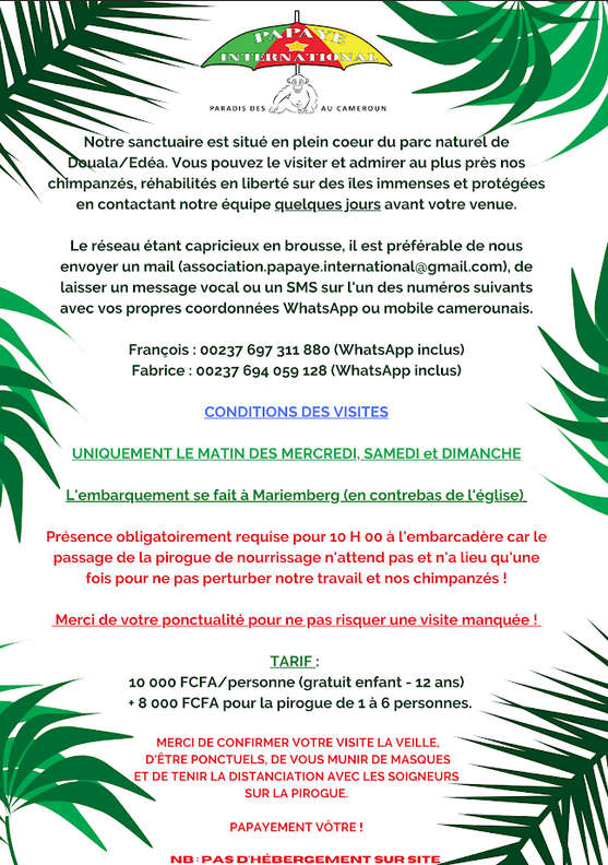 Anreise mit Auto oder Piroge möglich. Auto für einen Tag An- und Abreise 60€. Eintritt Schutzgebiet 16€/Person. Tel: +237 697 11 51 11; +237 697 331 880; +237 694 059 128. Übernachtung Stand 2023 nicht möglich, bald aber wieder, Bauarbeiten laufen. Zelt aufschlagen möglich. Guide nicht notwendig. Wir (3 Personen) zahlten insgesamt für Guide, Auto und Trip 150€ + Trinkgelder (9-15Uhr).