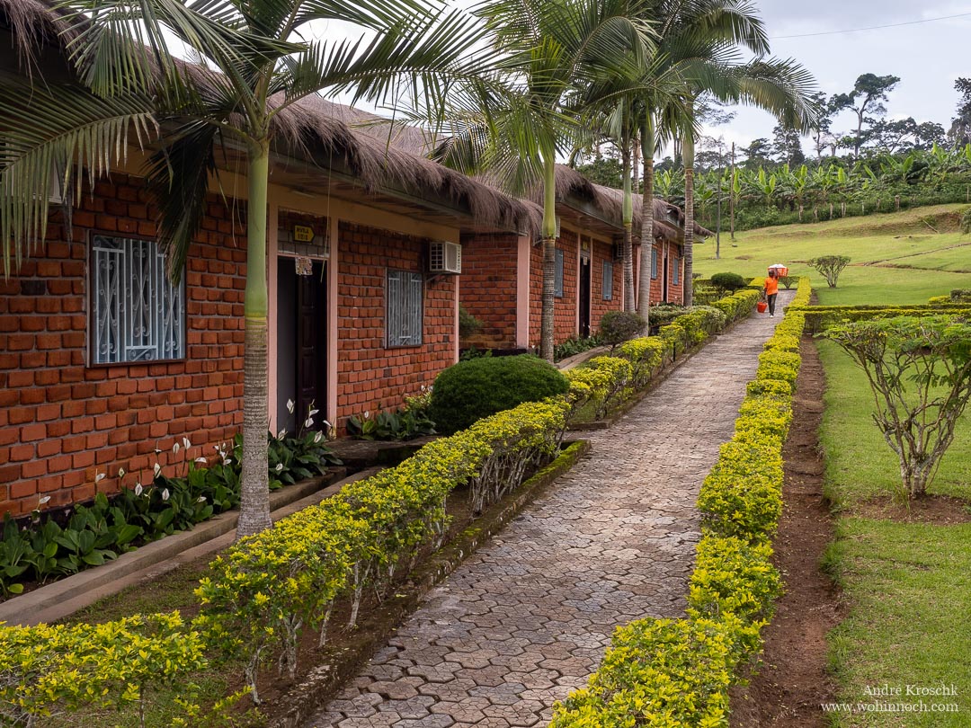 Es ist eigentlich ganz simpel: Der kamerunische Minister für weiterführende Bildung Jacques Fame Ndongo erblickte hier 1950 das Licht der Welt. Nkolandom musste damals ein einfaches Dorf mit Trampelpfaden, ohne Strom und fließend Wasser gewesen sein. Doch das sollte nicht so bleiben. Dank der Zuwendungen des Ministers hat der Ort eine außerordentliche infrastrukturielle Behandlung erfahren. Die eigens errichtete Hotelanlage neben Ndongo’s eigenem Wohnkomplex ist dabei noch längst nicht alles.