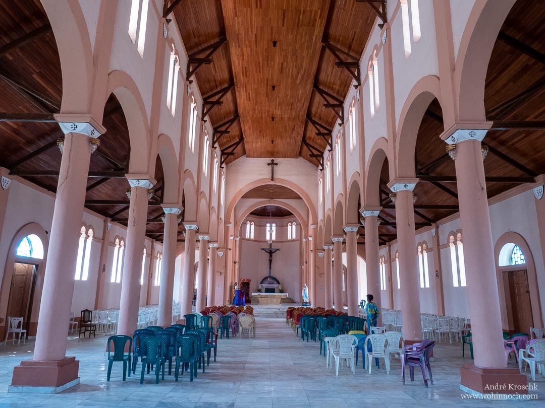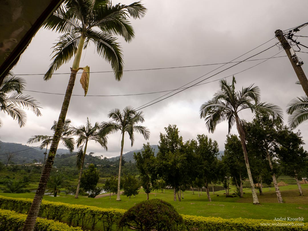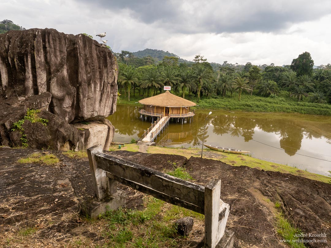 Bei meinem Spaziergang über das Gelände übertraf sich das Dorf ein ums andere Mal selbst. Neben den schroffen Felsen, die ich gestern Nacht schon gesehen hatte, verbargen sich noch eine für den Ort fast dekadent riesige Kirche, inklusive kurzen Wanderwegen auf denen man anhand von Glaubensbildern die Kreuzigung Jesus‘ nacherleben konnte. Auf der anderen Straßenseite, direkt hinter den Palmenplantagen, lag das Hydropole, ein auf Stelzen errichteter Konferenzsaal inmitten eines Sees. Und es geht noch weiter.