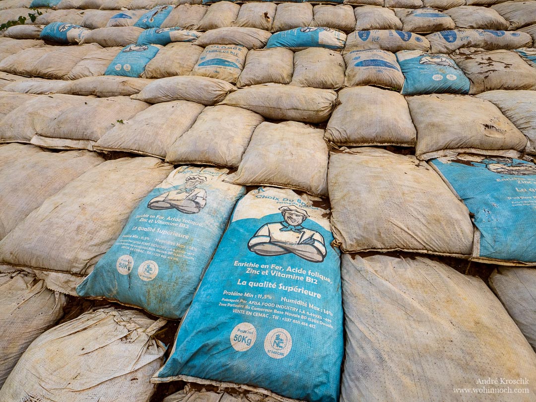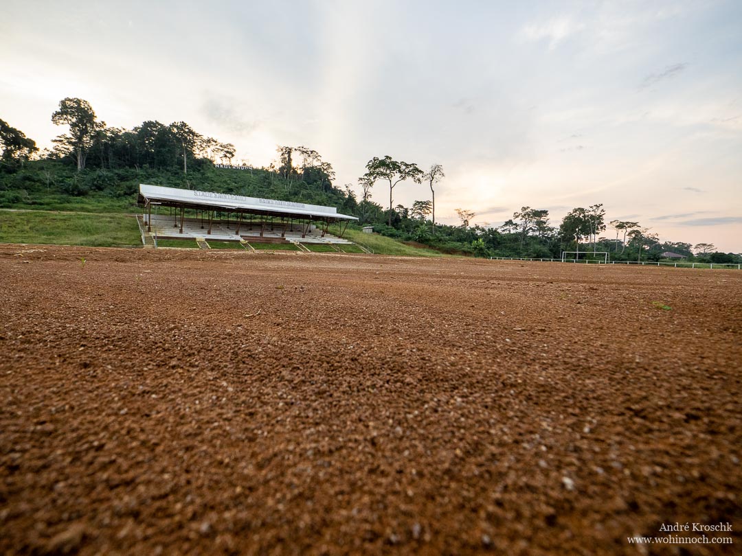 Eigentlich wollte ich mich heute von nichts mehr überraschen lassen. Doch als ich mittlerweile am Dorf vorbei, irgendwo zwischen hohen Kapokäumen eine Erdstraße hinaufstieg, war diese Mission eindeutig gescheitert: Vor mir breitete sich ein Fußballplatz mit Zuschauertribüne aus. Um den Fußballplatz in der Regenzeit ausreichend zu befestigten, waren an seinem Fundament tausende zur Absorption bereite Sandsäcke ausgebreitet. Darauf ein kräftiger Bäckersmann, der mir mit seinen hochgekrempelten Ärmeln sein vitaminreiches Weizenmehl verkaufen wollte. Ein schöner Moment.