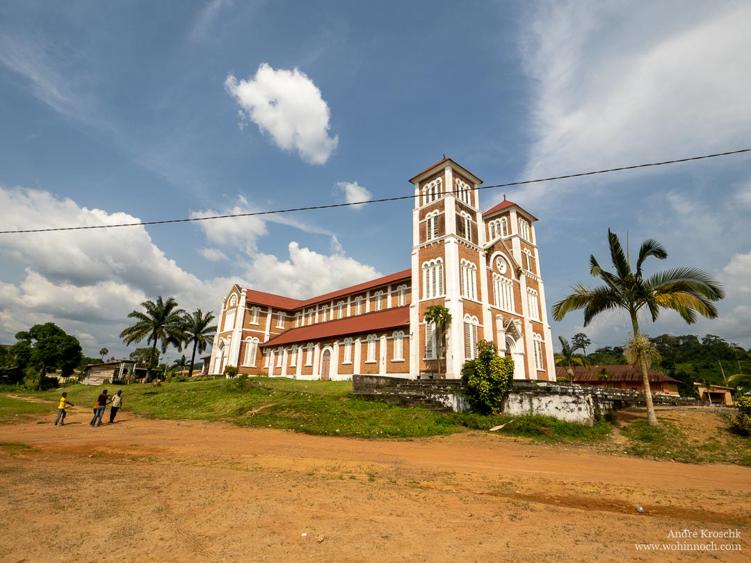Ebolowa begrüßt uns wie viele andere Großstädte auch: Wir rollen an Snacks und Wohnhäusern durch die Außenbezirke, biegen dann einmal an einem großen, begrünten Kreisverkehr ab, streifen an einer breiten Straße die schon lang verwaiste Präsidententribune und befinden uns dann plötzlich in einem dichten Netz aus Marktständen und Restaurants, an dessen einem Ende eine Moschee und dem anderen eine Kirche steht. Dabei ist Ebolowa jedoch auch eine sehr saubere Stadt geblieben, in der sich die beschrieben Szenen nicht selten an hübsch gewellten Berghängen abspielen. Vor allem die wunderschöne Cathédrale Saints Anne & Joachim d’Abang hat es uns angetan.