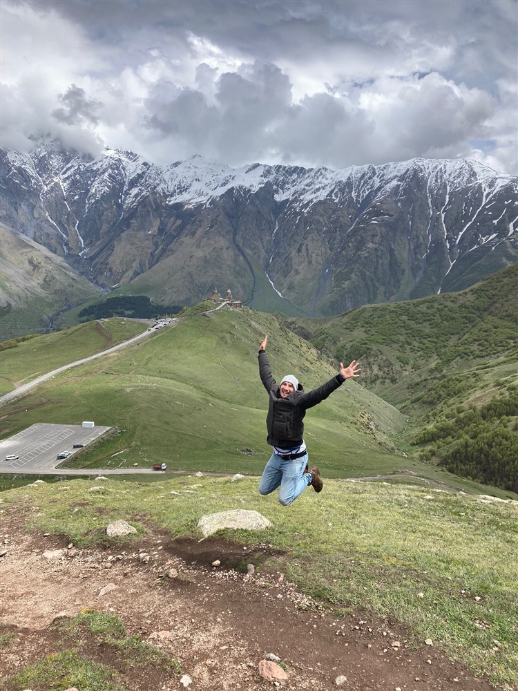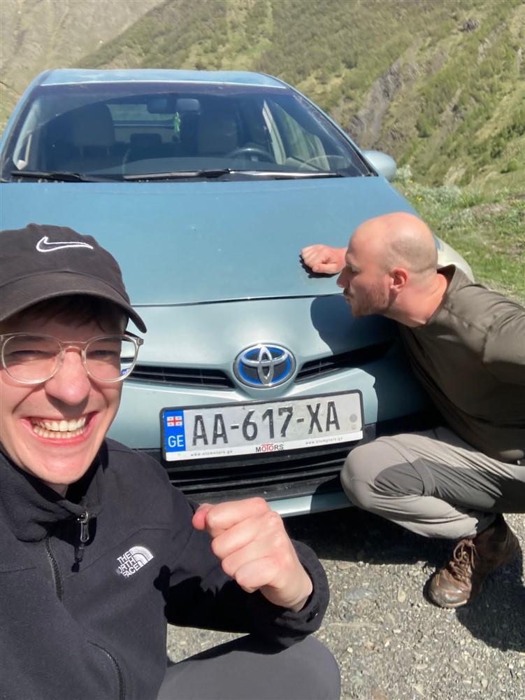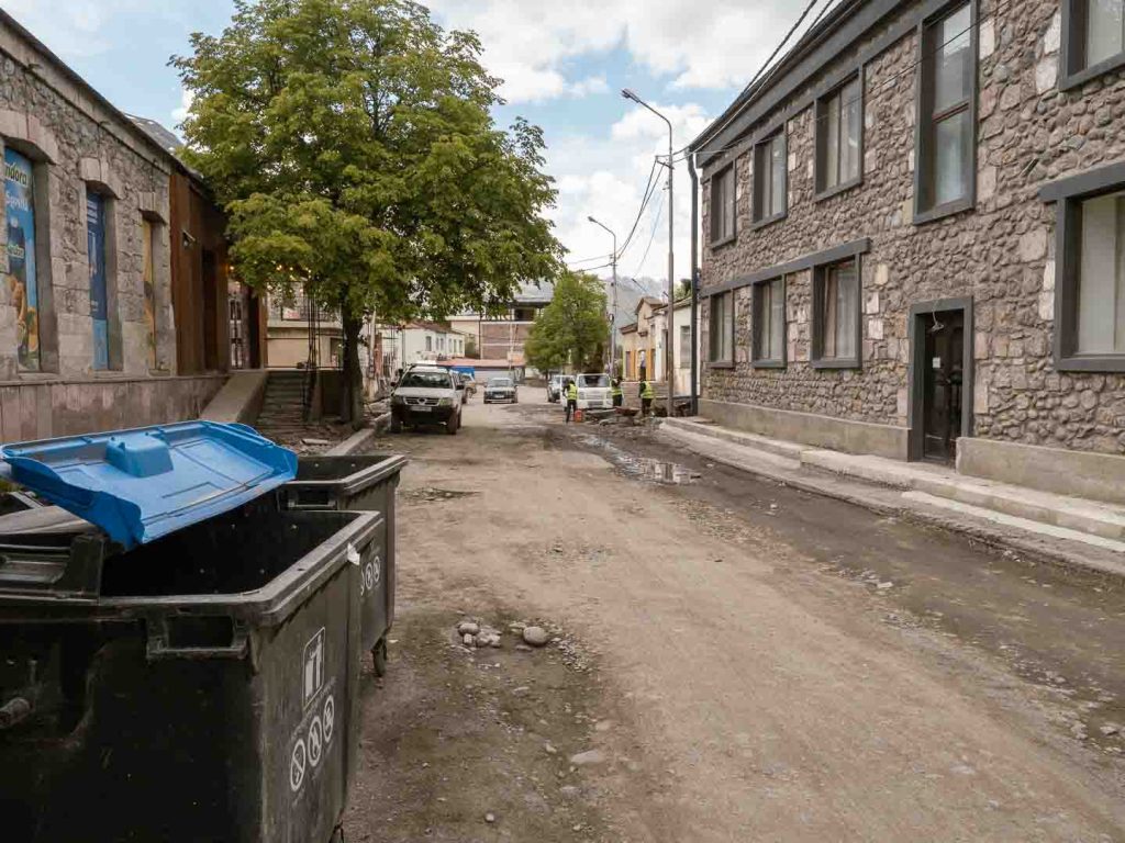 Stepantsminda wirkte auf uns wie ein Kriegsgebiet: Zerbombte Straßen, ständig die Gefahr von umherfliegenden Mülltonnen erschlagen zu werden, meterhohe Gullis, an denen man sich rasch den Zehnagel aufreißt und alte, grimmige Männer, die in ihren Autos sitzend das Geschehen beobachten, als wären sie jederzeit bereit in die nächste Schlägerei einzugreifen. Die Auflistung lässt sich beliebig fortsetzen: In der kleinen Backstube wird beim Teig kneten geraucht, Besoffene kippen vor unserem Auto vom Fahrrad und ständig riecht es nach frischem Teer. Das alles erlebten wir in vier Tagen. Den Aufenthalt können wir trotzdem empfehlen: Die Aussicht ist einfach zu gut.