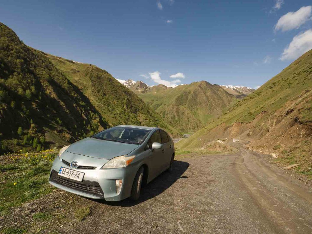 Der Chaukhi Pass ist einer der höchsten Pässe Georgiens. Von dem kleinen entlegenen Dorf Juta, auf 2.200 Metern Höhe, kann man den Pass mit farbenfrohen Seen erkunden und sogar bis noch entlegenere Roshka wandern. Unserer Tagestrip startete in Stepantsminda. Mit dem Auto ging es vorbei an Felsbrocken mit eingravierten Gesichtern. Zu welch unwahrscheinlichen Kreationen die Natur in der Lage ist, da staunt man doch immer. Weiter ging es die Erdpiste hinauf. Unser Hybrider- tiefgelegt und ohne Allradantrieb – leistete uns gute Dienste, doch irgendwann war Feierabend. Wir mussten das Auto nach gewagten Berg-Manoeuvern in einer Seitentasche stehen lassen und noch drei Kilometer bis Juta laufen.