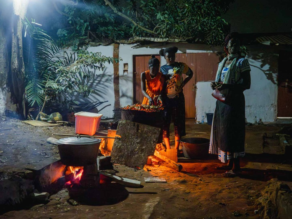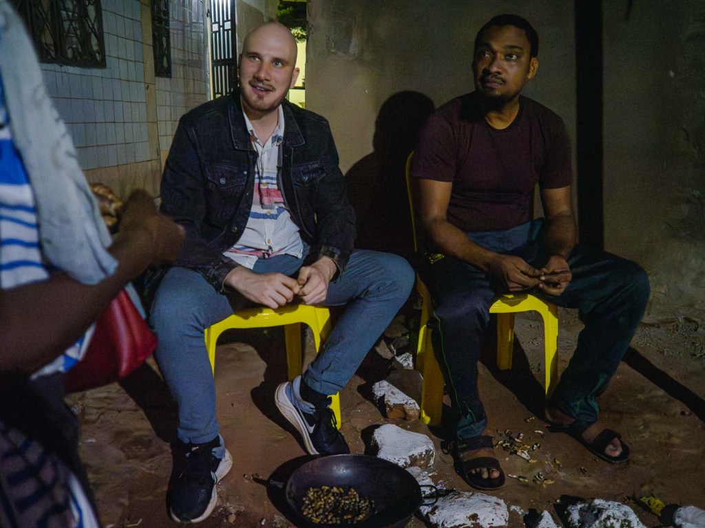 Als wir am Freitagabend im Haus der Familie meiner Freundin ankamen, waren die Vorbereitungen für die morgige Zeremonie schon in vollem Gange. Tanten, Cousins und Nachbarn halfen im warmen Licht des Feuers eifrig beim Grillen der dutzenden Hühner und beim Räuchern der Fische. Die Männer, denen bei solchen Vorbereitungen schnell langweilig wird, weil sie ihre Mitarbeit auf das Anzünden des Grills beschränken, warfen derweil ein paar Erdnüsse in eine Pfanne und schnabulierten diese mitsamt eines Tetrapack Weins.