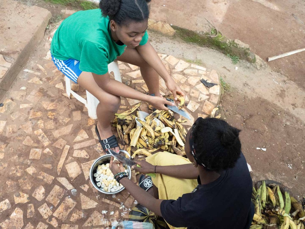 Wer dachte, die Vorbereitungen seien mit dem gestrigen Tag abgeschlossen gewesen, der irrt sich gewaltig. Als ich mich gegen neun aus dem Bett schälte, war das Gewusel bereits groß. Gut möglich, dass mehr Nachbarn zum Helfen gekommen sind, als ich Menschen kenne. Sie schleppten Stühle heran, trugen Holzlatten und spannten weiße Zeltplanen auf. Auch das Kochen wurde mit doppelter Anstrengung fortgesetzt. Um 200 Mägen zu füllen müssen jede Menge Kochbananen geschnippelt und Salatblätter gerupft werden. Nur gut, dass man in Kamerun nicht viel von Salaten hält und stattdessen lieber Eingeweide und andere Grobheiten in den Kochtopf wirft. Das spart Zeit und Arbeit. Ich erhielt derweil den Job des Luftballon-Aufblase-Assistenten – eine ehrhafte und verantwortungsvolle Aufgabe.