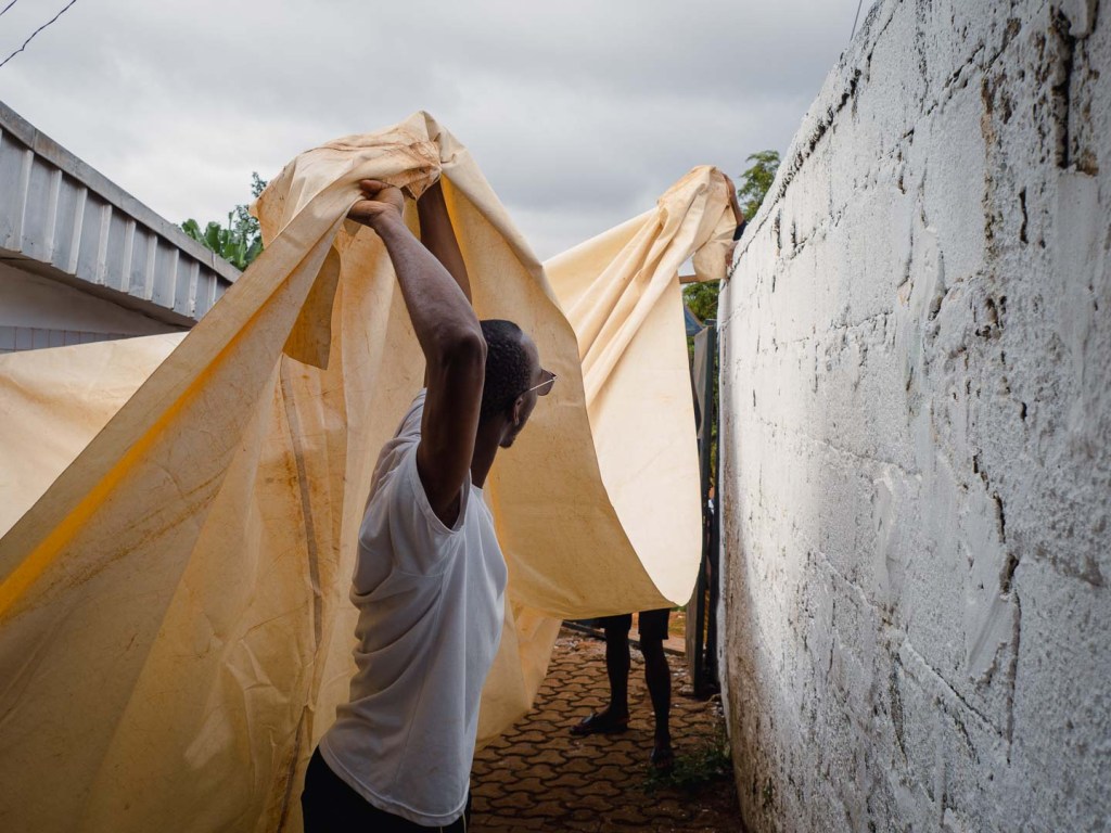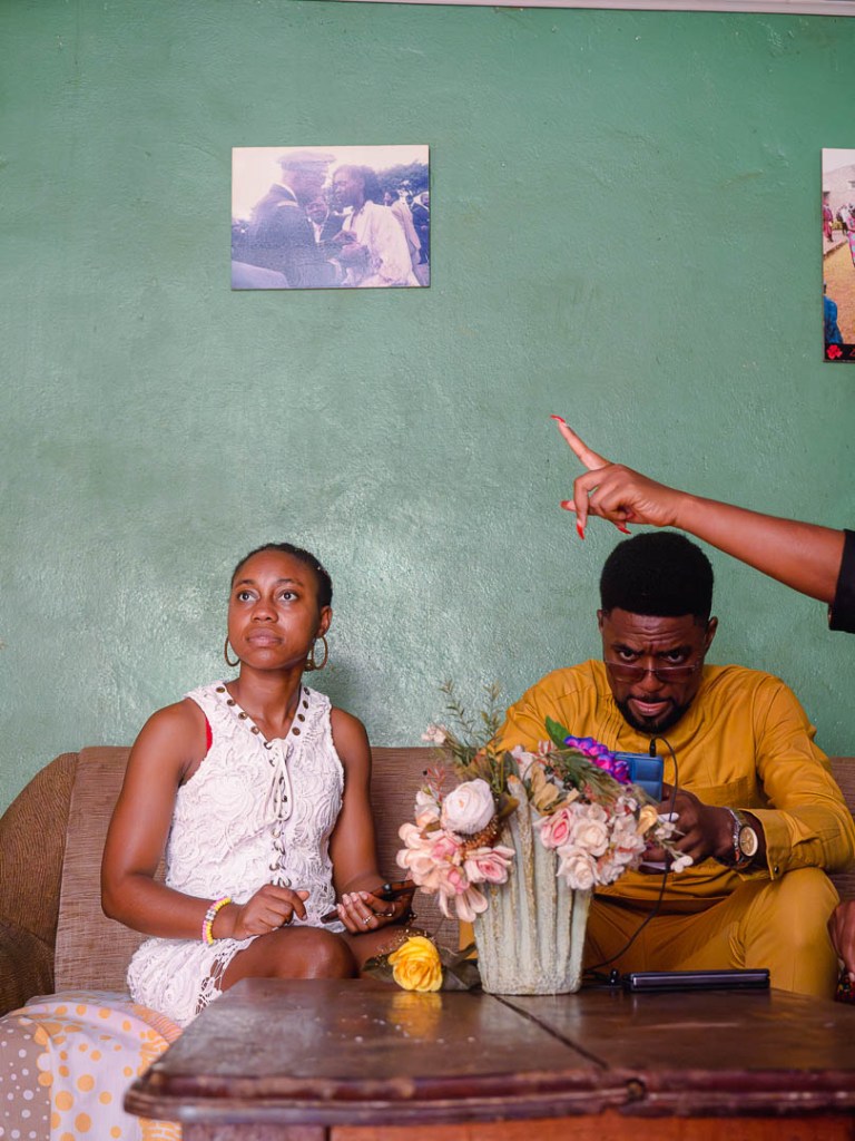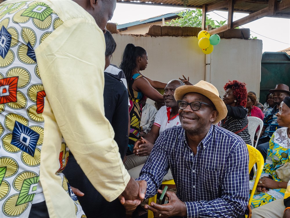 Die Zeremonie war so farbenfroh und lebendig, dass ihr euch sie am besten in Videoform anseht. Sie begann mit einer Messe, die musikalisch vom Kirchenchor begleitet wurde – in dem auch die Braut singt. Gesungen und gebetet wurde hierbei sowohl auf Französisch, als auch auf Ewondo, der lokalen Sprache in der Yaoundé-Region. Anschließend folgte der Austausch zwischen den Familien, dem die Braut übrigens nicht beiwohnte. In einer Mischung aus Theater, Komödie und Tradition ergriffen die Chefs beider Familien das Wort. Sie bedankten sich gegenseitig für die Vorbereitungen, tauschten zahlreiche freundliche Gesten aus und überreichten Gaben wie Reis, Stoffe und Whisky. Erst nach diesem feierlichen Akt wurden die Gäste mit herzlichem Händeschütteln im Haus willkommen geheißen. Es folgte eine kurze Pause, bevor die Zeremonie auf ihren Höhepunkt zusteuern sollte: Die Vorstellung der Braut.