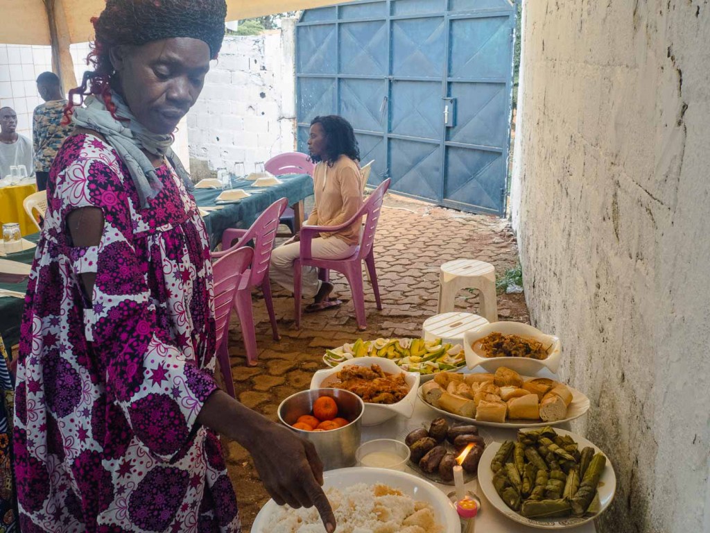 Endlich war es soweit: Das mühevoll vorbereitete Buffet durfte verzehrt werden! Allerdings nicht von uns. Die Gastfreundschaft gebot es, dass zuerst die Gäste serviert wurden – und zwar mit dem besten Stück Fleisch, sowie dem bequemsten Platz im Wohnzimmer. Ganz selbstverständlich wurden Speisen und Getränke in der Reihenfolge von Rang und Ansehen verteilt. Der Wein wurde entkorkt, und die 5-Liter-Kanister mit Palmwein aufgeschraubt. Erst nachdem die Ehrengäste versorgt waren und ihre Hosenknöpfe schon lockerer saßen, durften auch wir uns an den übrig gebliebenen Salatblättern des Buffets bedienen.