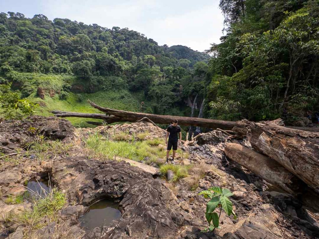 Nach der kurzen Erfrischung führte uns unser Guide auf das Plateau, von wo das Wasser in die Tiefe stürzt. Hier bekommen wir von dem Naturspektakel nicht mehr mit, als ein bedrohliches, sonores Brummen. Besonders beeindruckt haben uns hierbei die riesigen Baumstämme, die von sonstwo angespült wurden und nun schon seit Monaten am Rande des Abgrunds hängen. Es scheint, einige dieser Stämme hätten Gefallen an in ihrem neuen zu Hause gefunden und beschlossen erneut Wurzeln zu schlagen. Als würden sie gar nicht daran denken, den schönen Aussichtsort für einen Augenblick freien Falls zu opfern. Nachdem wir ein wenig umherklettern durften, kehrten wir schließlich nach circa zwei Stunden zu unserem Auto zurück.