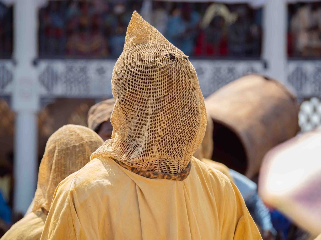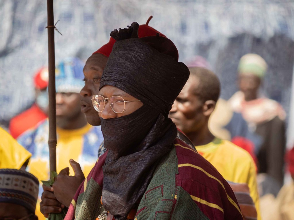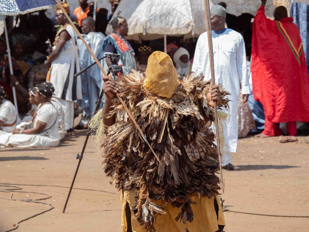 Es ist beeindruckend, wie majestätisch König Njoya auf seinem Thron sitzt, während um ihn herum ein geschäftiges Treiben herrscht, besonders durch uns Pressefotografen. Während er uns ignoriert, richtet er seinen wachsamen, doch regungslosen Blick auf den Einmarsch der Geheimgesellschaft. Ihre Mitglieder tragen gelbe Masken, sind mit Säbeln bewaffnet und besitzen heute die Macht, ihn seines Amtes zu entheben. Begleitet werden sie von den Fonanguon, den sogenannten Animateuren. Diese 138 Frauen und Männer haben in den letzten Tagen jede Ortschaft besucht, um die Meinung des Volkes über den Zustand des Reiches einzuholen, ein Prozess, der Nshemme Ngû genannt wird. Jetzt ist der Moment gekommen: Das Urteil des Volkes wird dem König überbracht.