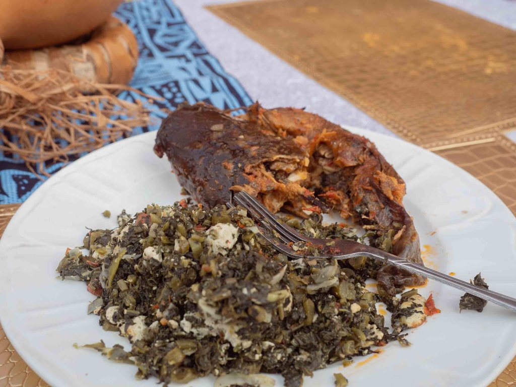 Weiter geht’s zur Fressmeile, wo das Klirren von Messern den dichten Rauch durchschneidet. Überall wird Fisch und Fleisch gegrillt, der Duft ist verlockend. Stände mit typisch kamerunisch selbstbewussten Namen wie „Kontinent Nummer eins“ laden ein, und wir lassen uns an einem Rundtisch nieder. Bei ein paar Bier probieren wir Japshe, ein Gericht aus grünem Gemüse, Pistazien und Couscous, das – wie Ahmed erklärt – mit den Händen am besten schmeckt. Er hat recht!