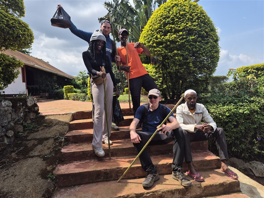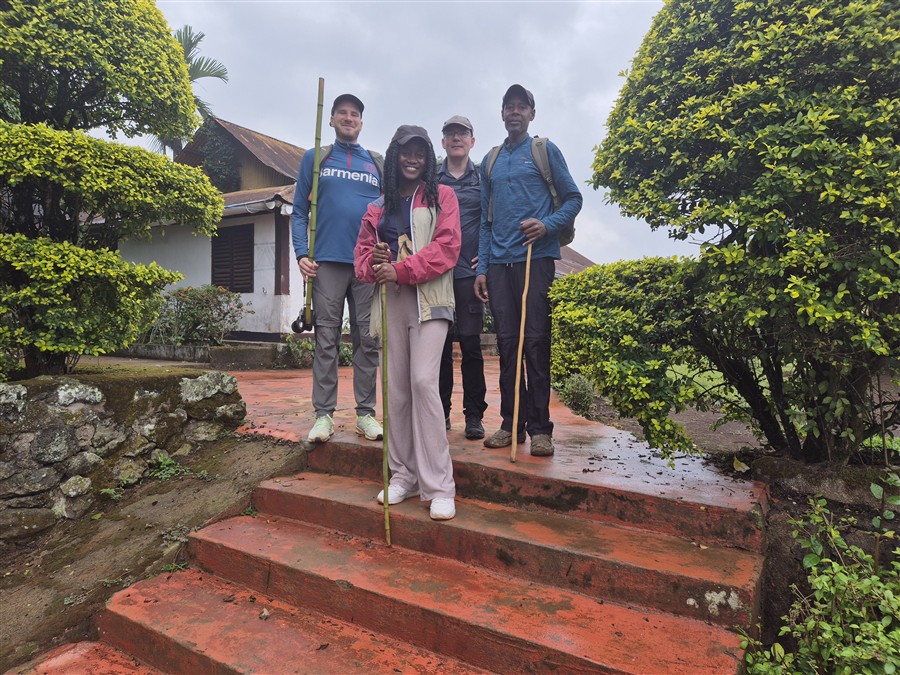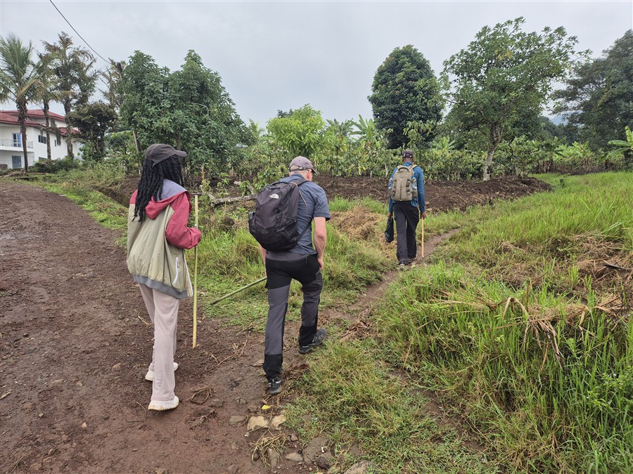 Am Morgen war die Luft rein und die Sonne versteckte sich hinter harmlosen Wolken – bestes Wanderwetter. Unser Marsch begann an der Villa Kleber-Collier, unserer Unterkunft, der der Regen letzte Nacht alle Dächer gereinigt hat. Wir waren zu viert: Mein Vater, Flavy, ich und unser Guide Alidou, kurz Ali. Er sollte uns in den nächsten zwei Tagen begleiten.