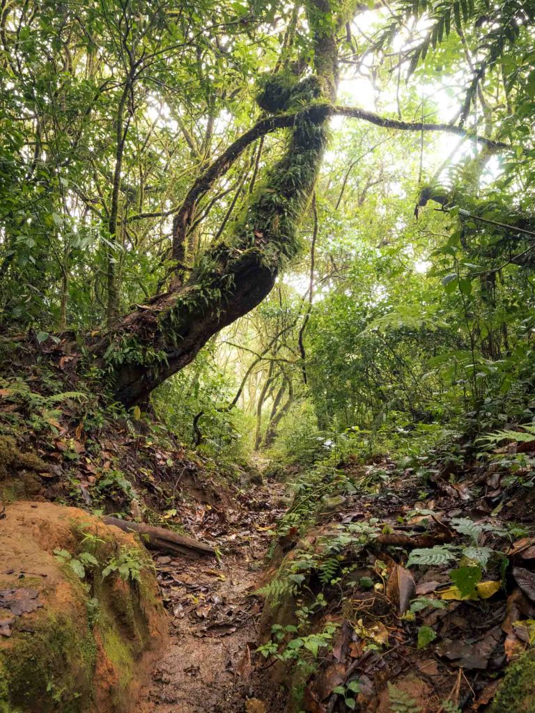 Der Wald hatte es mir besonders angetan: Verwachsene Baumstämme, sich windende Ranken, ein dichtes Blätterdach aus Tropenpflanzen. Das Sonnenlicht drang nur stellenweise durch, wurde von Pfützen reflektiert, alles leuchtete in grün-goldenem Schimmer. Wir mussten höllisch aufpassen…, zu spät: Ich rutschte aus und schlitterte ein paar Meter durch den Matsch.