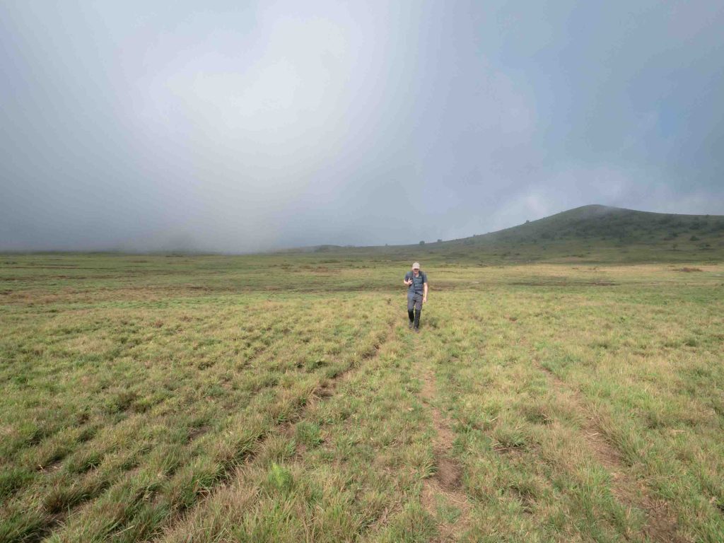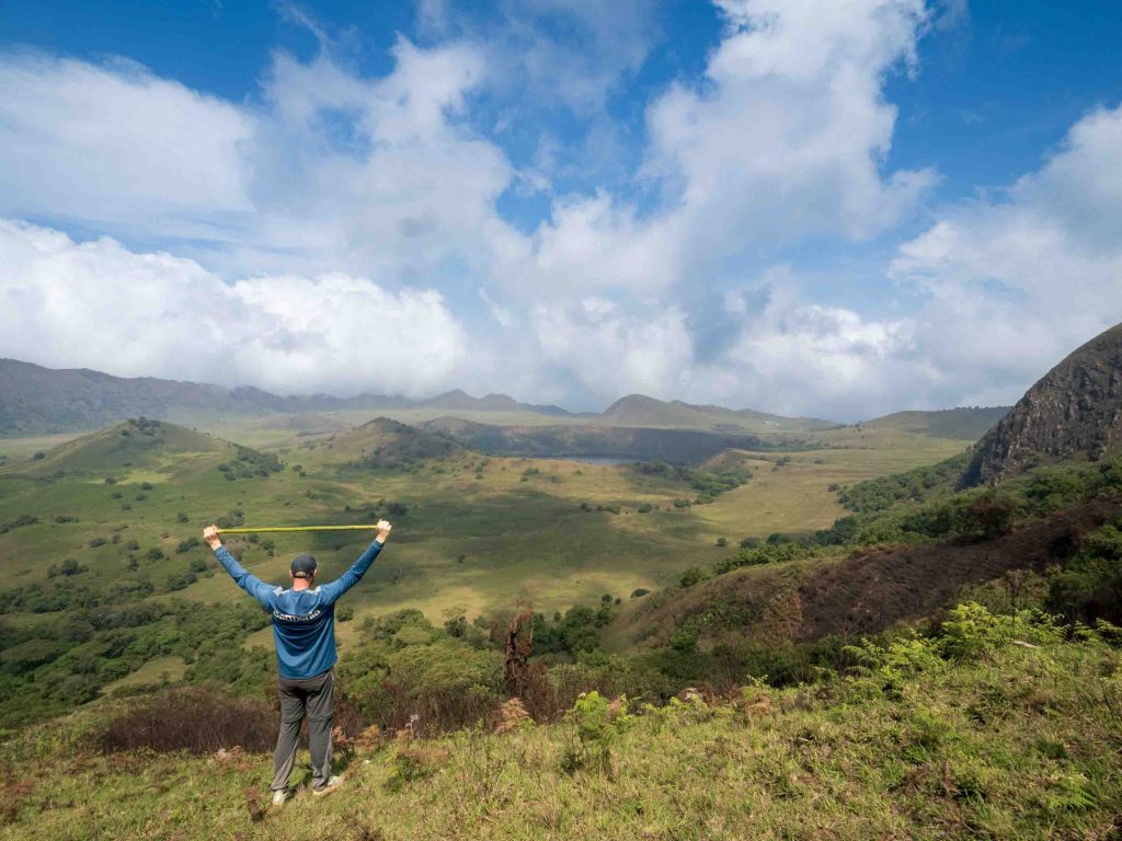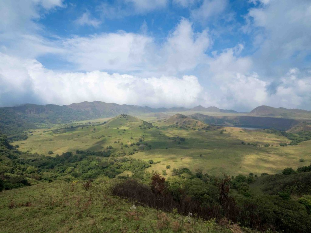 Nachdem wir den Wald und den Bergkamm hinter uns gelassen hatten, standen wir auf der Schwelle zum Tal. Was für eine Aussicht! Vor allem, wenn man sich die Nebelwolke wegdenkt. Wenig später verzog sich der Dunst und wir sahen den weiten Kessel. In seiner Mitte: Die Kraterseen – unser nächstes Ziel.