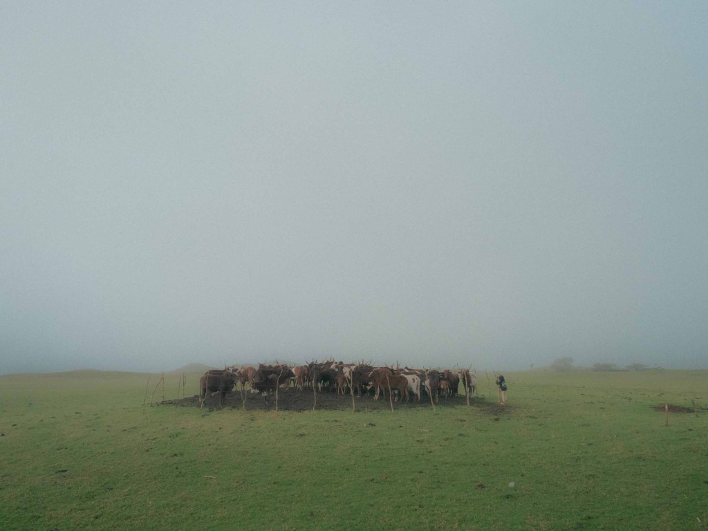 Der Weg zum Dorf war nicht mehr weit. Er führte uns durch eine neblige Pampa, wo wir auf eine verletzte Kuh stießen, sie war wohl gestürzt und hatte sich die Wirbelsäule gebrochen. Ein paar Hirten kamen hinzu und entschieden, das Tier vor Ort zu schlachten und abzutransportieren. Kurz darauf, wir waren schon ein paar Hundert Meter weiter, hörten wir bereits ein Motorrad heranrollen.