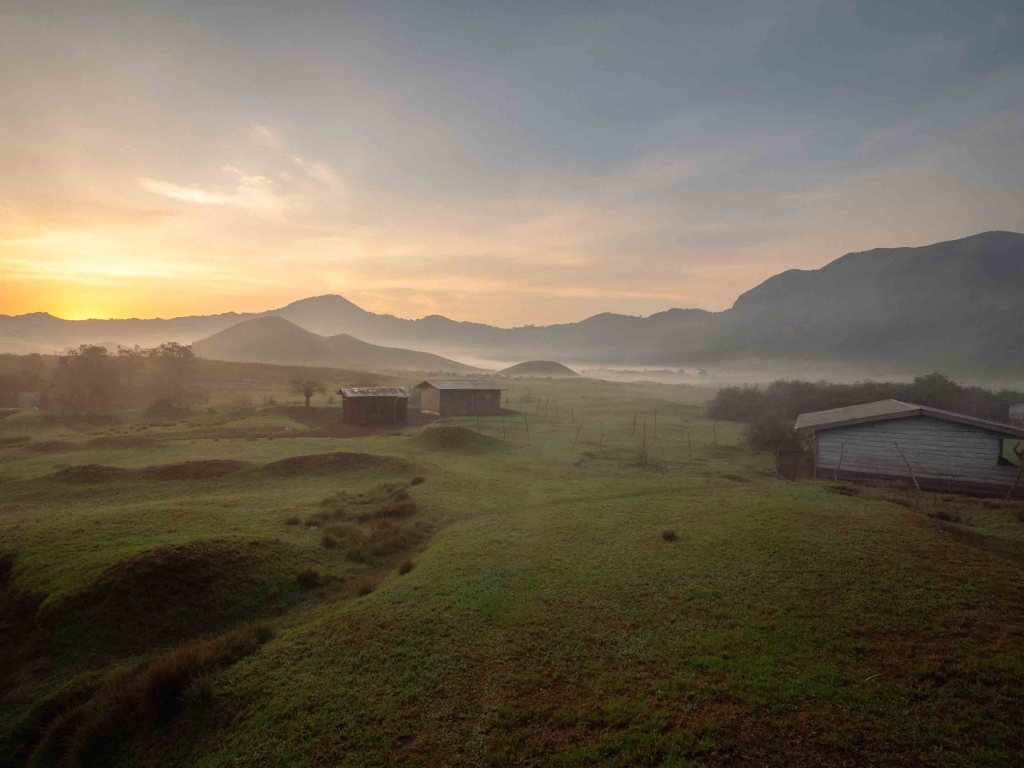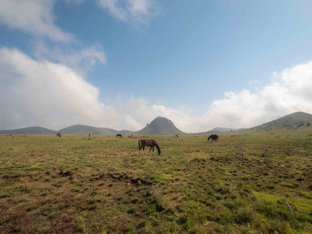 Beim Abstieg tauchten wir in eine andere Welt ein. Vom urwaldigen Hang noch das ferne Kreischen von Affen im Ohr, standen wir nun in einer Landschaft, die aussah wie Schottland im Spätsommer. Überall Wiesen, Schafe und Seen, die vielleicht nicht nur Fische beherbergen.