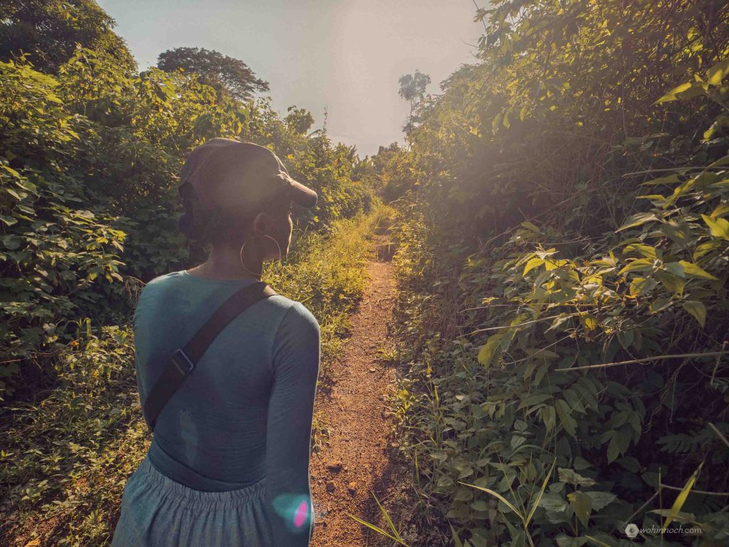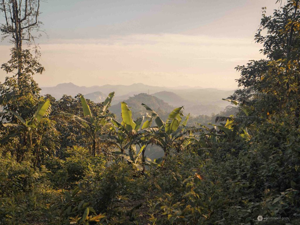 Wandern bei Dämmerung ist in Kamerun eine heikle Angelegenheit. Zwischen Nachmittagshitze und Finsternis liegen nämlich nur zwei Stunden. Die ersten Kilometer absolvierten wir demnach schwitzend und schnaufend und mussten uns trotzdem beeilen, um nicht bei Dunkelheit mitten in der Natur zurückzubleiben. Unser Weg führte uns auf den Nkolondom-Berg. Man startet in den jungen und anarchisch anwachsenden Vororten Yaoundés, und steht nach zwei Stunden auf dem noch von Regenwald bedeckten Gipfel.
