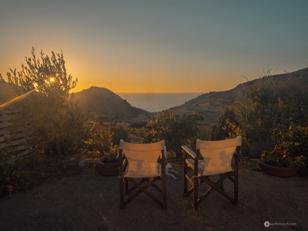 In einem abgeschiedenen Winkel der Insel erwarten uns Alexandra und Antonis, mit einem Empfang, der nach Urlaub schmeckt: frisches Gemüse aus dem Garten, Zitronenkuchen und ein Kartoffel-Omelett. Noch besser: Ihre Unterkunft verfügt über den vielleicht schönsten Fernseher der Welt. Pünktlich um 19:20 Uhr läuft das immer gleiche Programm: Sonnenuntergang über dem tiefblauen Meer, untermalt vom Geklingel der Schafsglocken.
