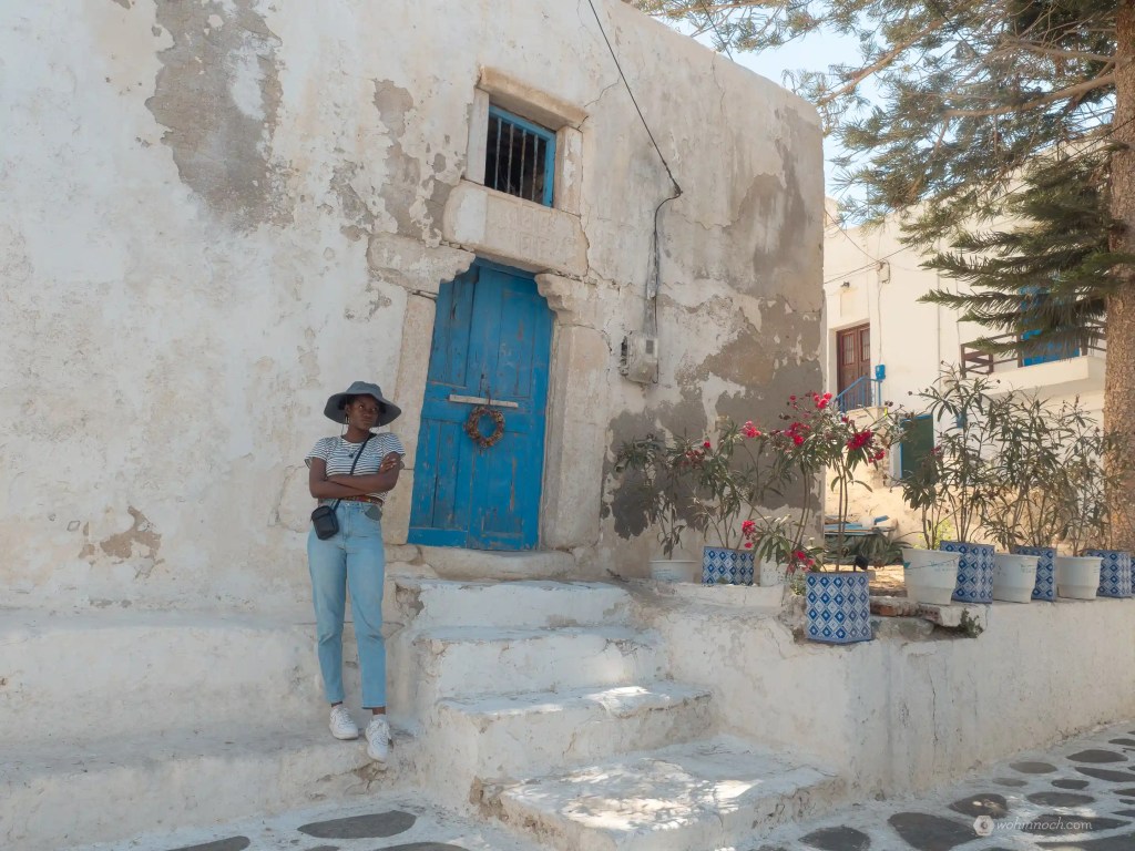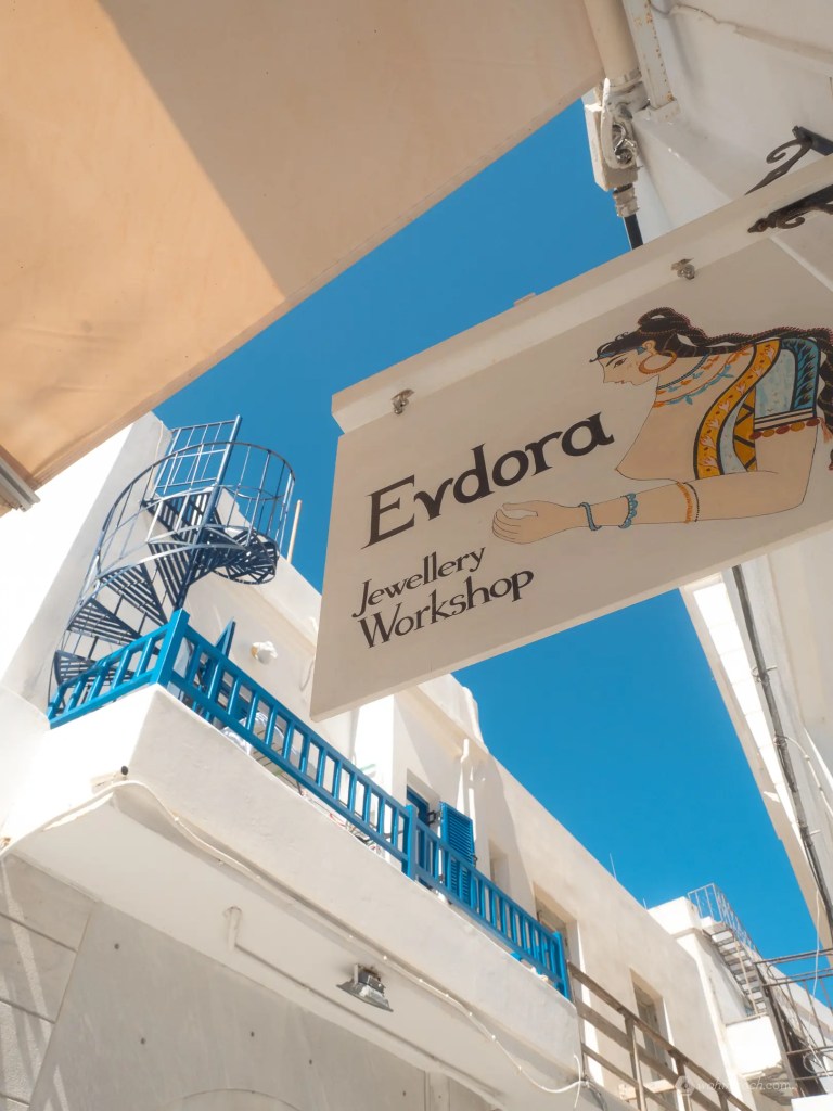 Am nächsten Tag besuchen wir Chora, die Hauptstadt der Insel. Weiß glänzende Häuser mit babyblauen Fensterläden umrahmen die engen Gassen voller Schmuckläden, Boutiquen und Souvenirshops. Über Treppenstufen steigen wir zum Castro hinauf, besuchen die katholische Kirche aus der Venezier-Zeit und landen schließlich in einer Kunstgalerie.